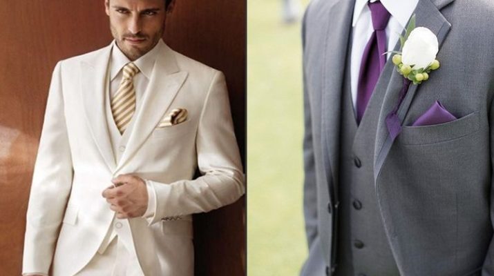 Что касается белого, то он поможет жениху сразу стать заметным на фоне гостей. Оттенки крем-брюле, шампанского, айвори, бежевые лучше выбирать, только если платье невесты выполнено в тех же тонах.