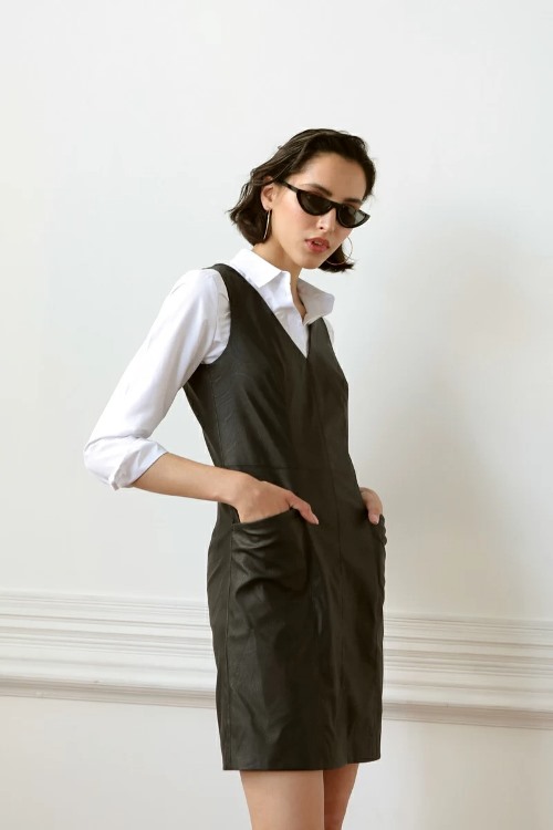Бренд SVYATNYH предлагает оригинальное платье-сарафан антрацитового цвета из качественной экокожи. Его можно комбинировать с белой рубашкой, тонкой водолазкой, блузкой с оригинальными рукавами. Из обуви можно выбрать изящные ботильоны или ботинки со шнуровкой.