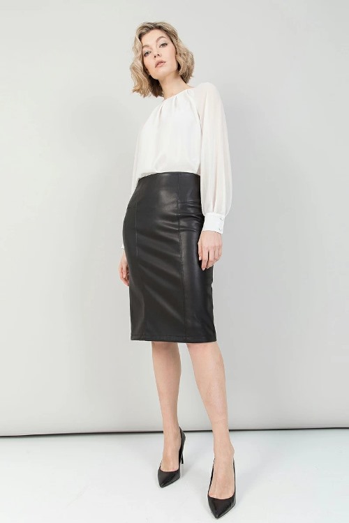 В каталоге брендового магазина SVYATNYH вы найдете юбки из экокожи (мини, расклешенные, узкие прямые, с мягкими складками и разрезами). Они хорошо сочетаются с офисными блузами, джемперами, свитшотами, водолазками. С мини можно комбинировать короткие топы и стильные косухи. Выбор обуви также достаточно широк (классические лодочки, ботильоны, сапоги, ботинки).