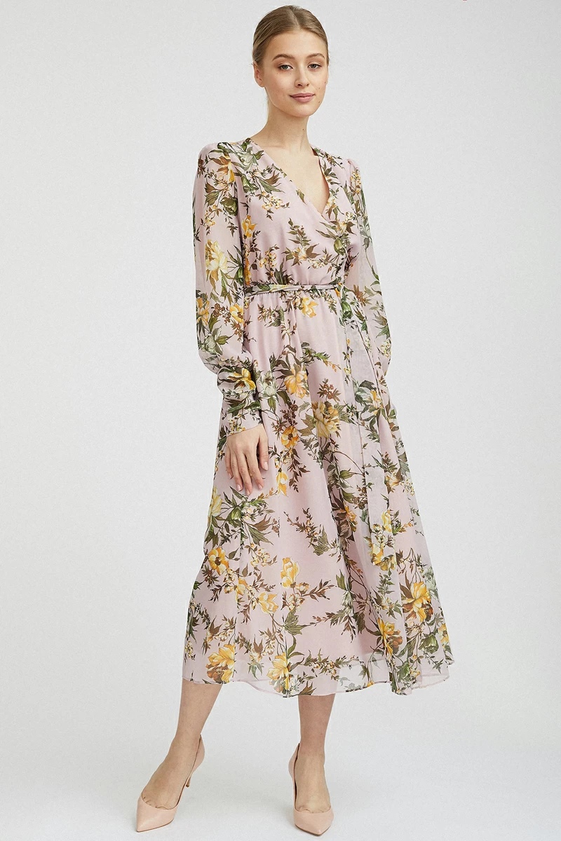 Розовый цвет отлично подчеркнет вашу женственность, а цветочный принь добавит в образ легкости. Длина макси, подчеркнет фигуру и покажет, что вы успешно разбираетесь в трендах. Вдобавок используйте пояс, он прекрасно выделяет вашу талию.