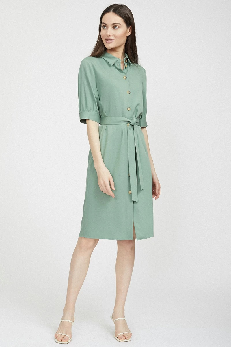Сдержанность — это однозначно зеленый цвет, а загадку добавят пуговицы и ремень. Фасон платья отлично дополняют объемные рукава, они делают руки изящными, а ремень выделяет талию.