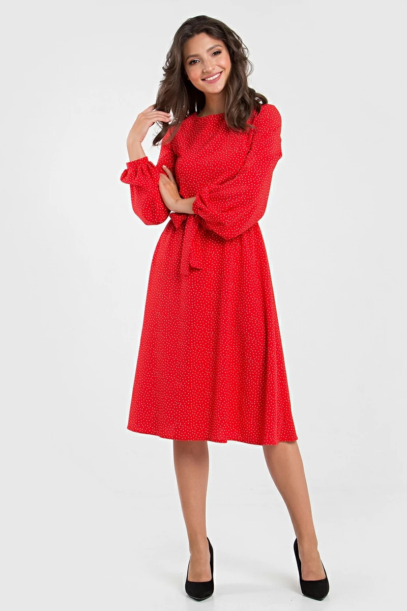 Страстный наряд в оттенке красного с объемными рукава вместе с принтом. В это платье мы вложили максимум сил, средняя длина уверенно показывает ноги, горошек помогает привлечь внимание, а имитация пояса подчеркнула твою страсть.