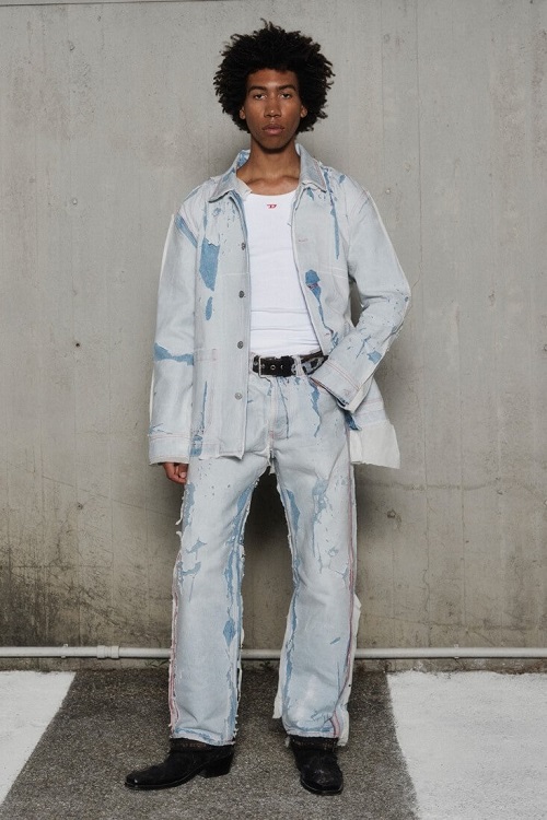 Для вдохновения можно посмотреть коллекции 2021-2022 бренда Diesel. В тренде будет оверсайз, небрежные принты и мелкие детали вроде красных строчек, контрастных полос. Носить джинсовый костюм лучше с белой футболкой, кожаным ремнем и черными ботинками.
