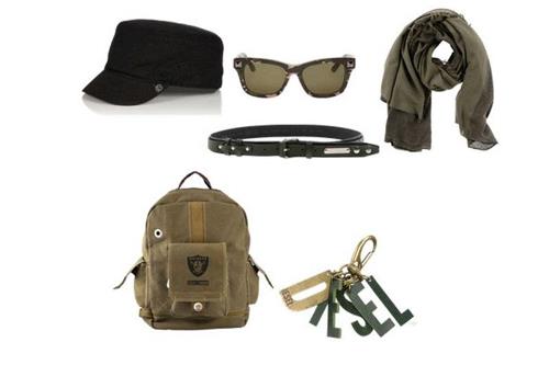 Об аксессуарах military стоит сказать отдельно, поскольку без них ни один образ не будет завершенным. Все они достаточно колоритные и заметные, поэтому лучше, если их будет немного. Среди популярных вариантов можно выделить: очки-авиаторы, большие часы, армейские нашивки, ремни с массивными бляхами, армейские жетоны, браслеты и кольца, кожаные, с шипами. Сумки в стиле military выделяются длинными ремнями, а также прочными и практичными материалами (натуральная кожа или плотная ткань с камуфляжным принтом).
