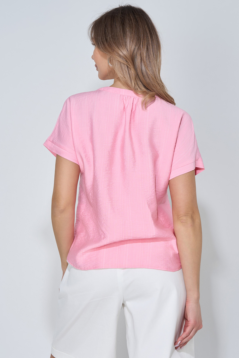 Блузка со спущенной линией плеча, воротник-стойка. Длина: 58 см.
