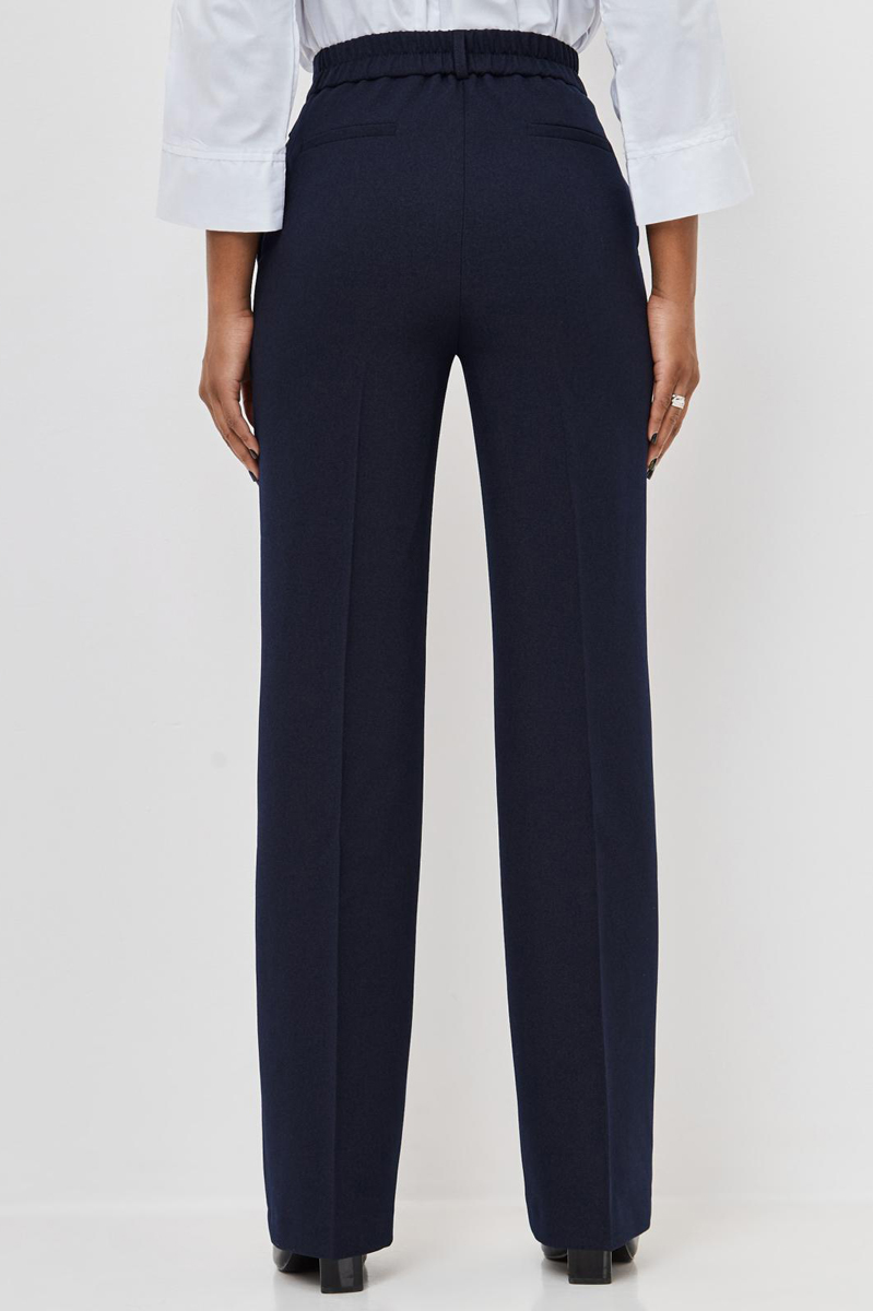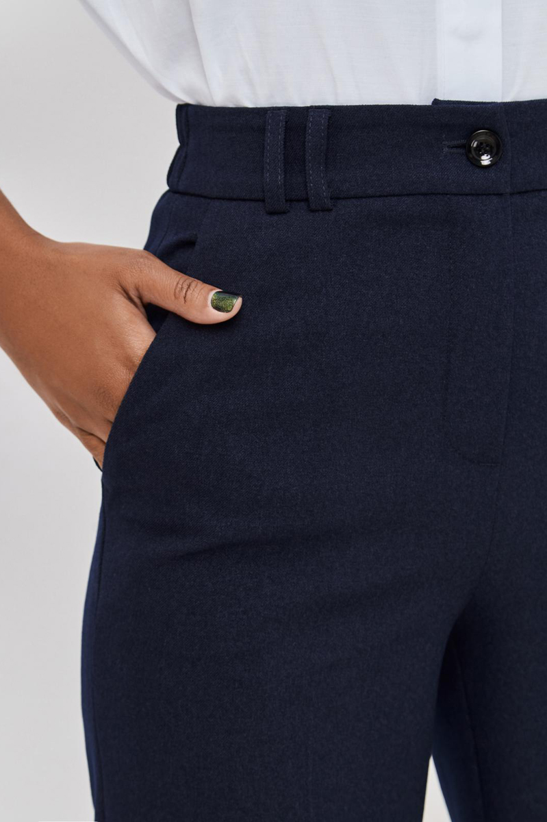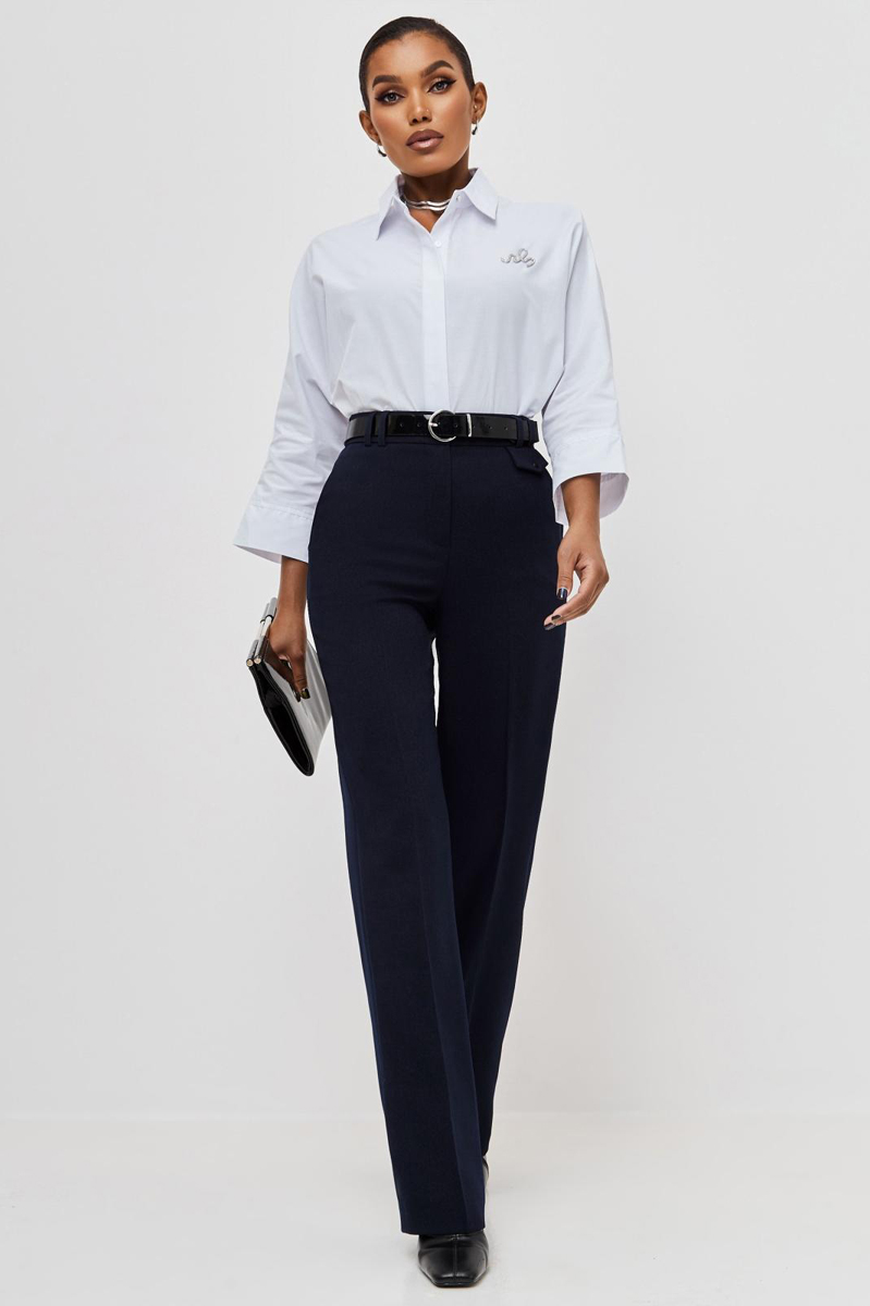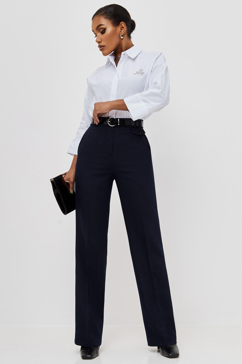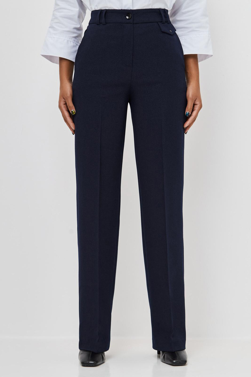 Прямые брюки с высокой посадкой, застежка на пуговицу, боковые карманы спереди и прорезные сзади.