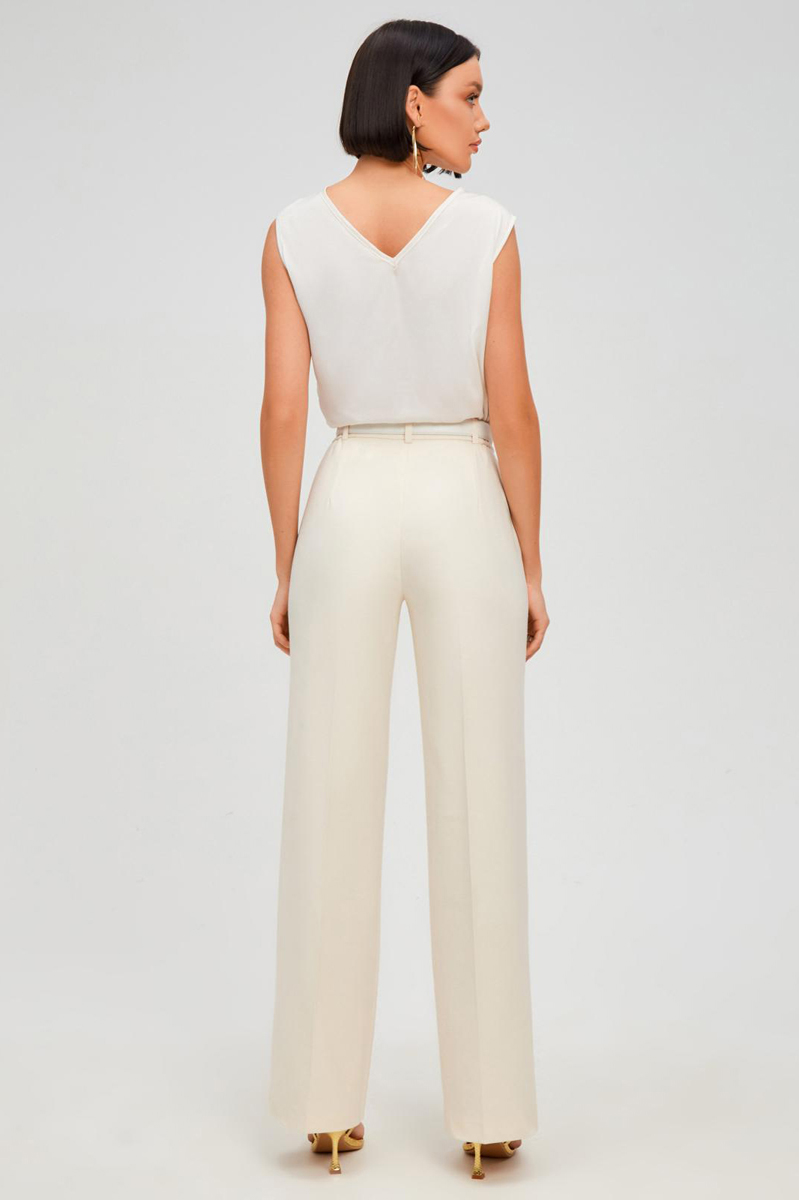 Прямые брюки с высокой посадкой, застежка на пуговицу, боковые карманы спереди, шлевки для ремня
