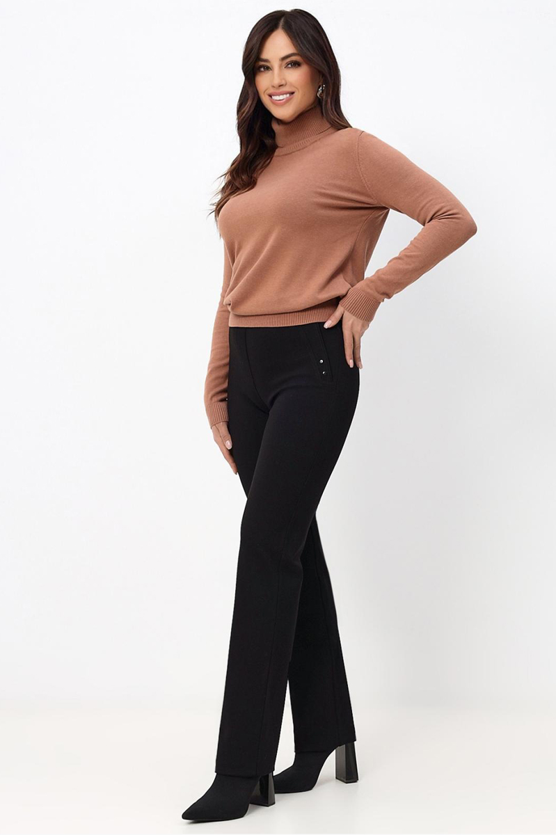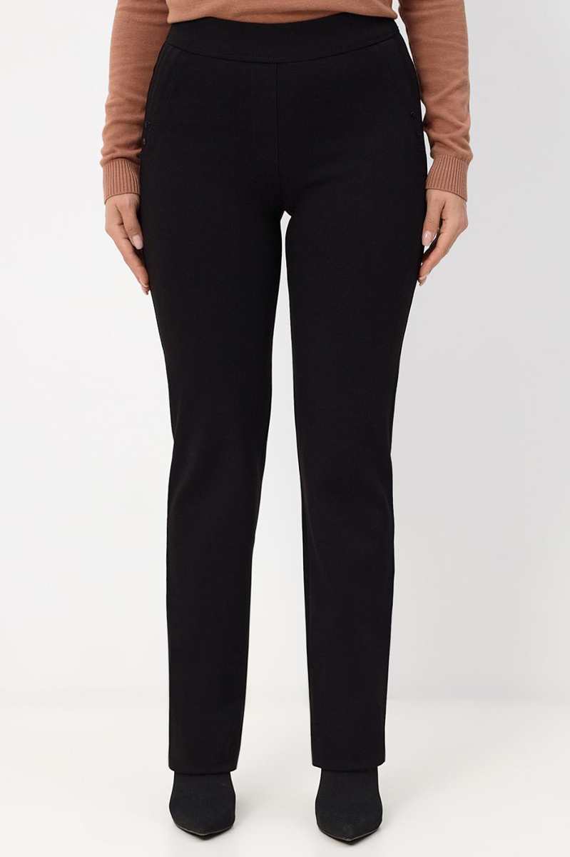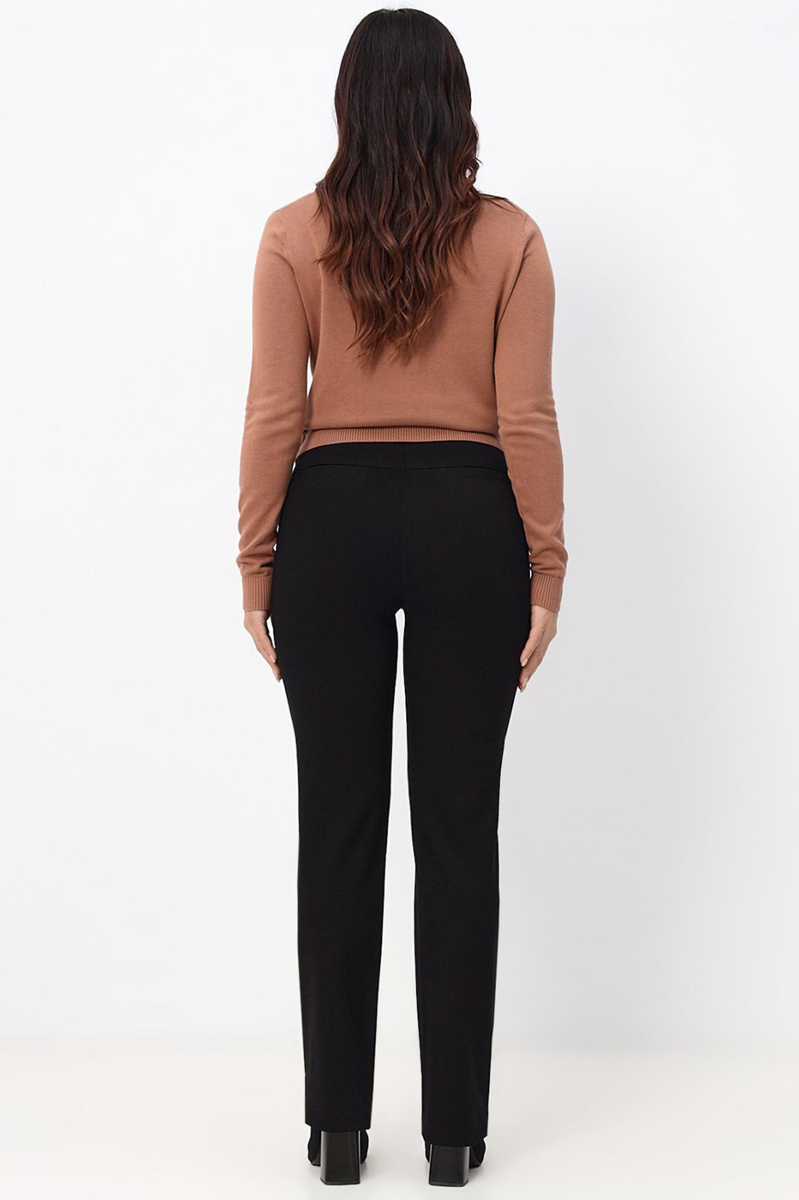 Брюки прямого кроя, с высокой посадкой, без застежки, с эластичным поясом, спереди имитация кармана, сзади кокетка и прорезные карманы.