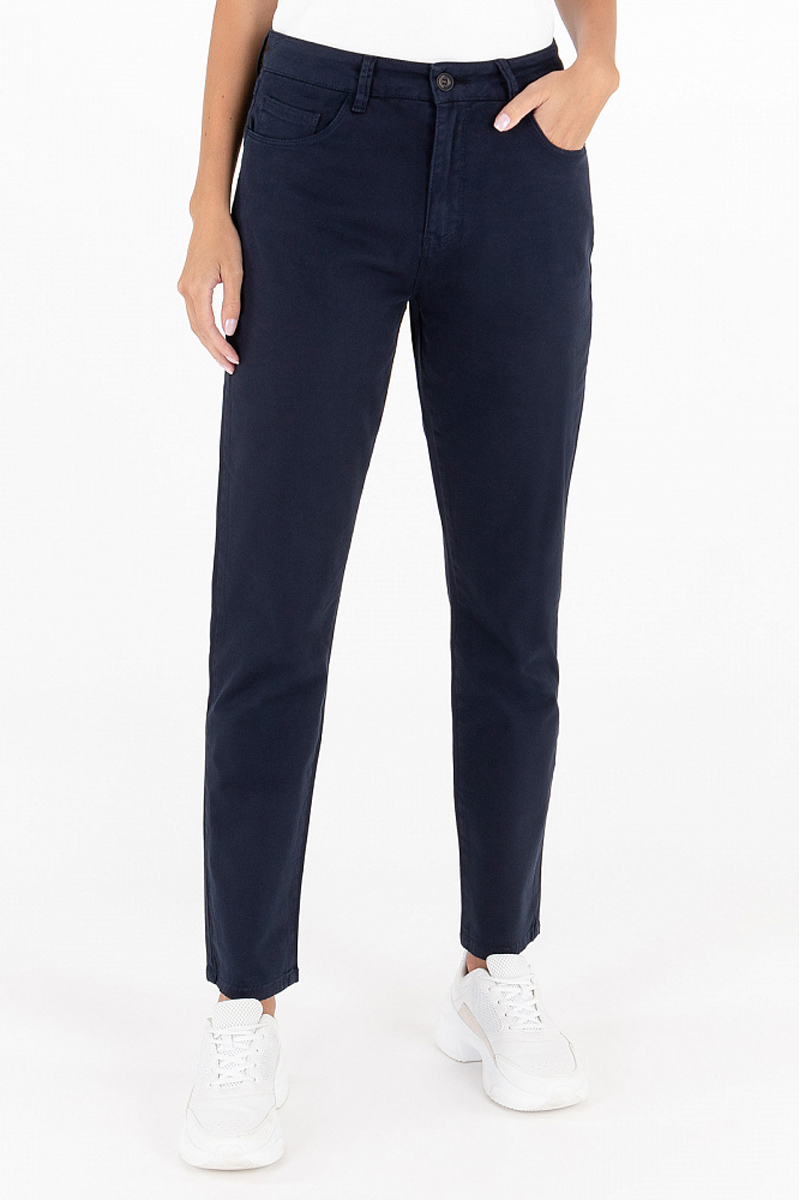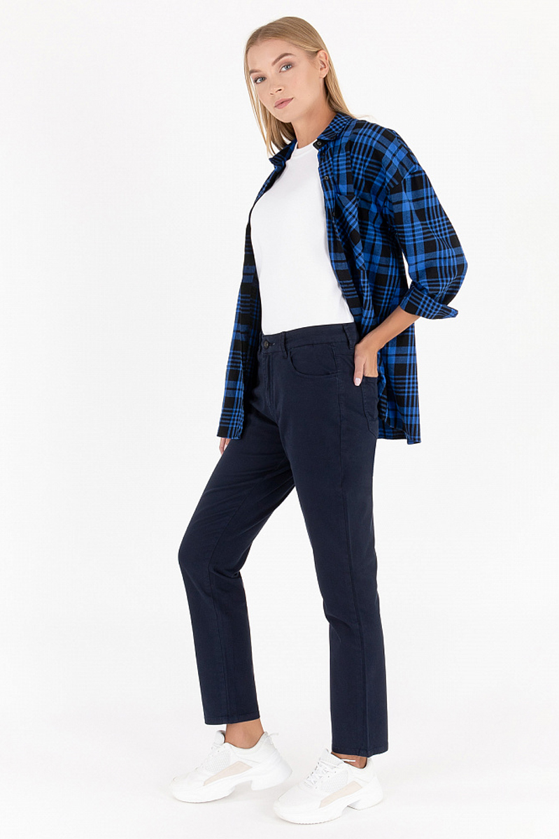Женские брюки в стиле "бойфренд" тёмно-синего цвета. Прекрасная альтернатива классическим офисным брюкам. Брюки выполнены из хлопка с добавлением небольшого количества эластана. Брюки имеют очень интересную фактуру, которую приятно рассматривать и трогать. Базовая модель с удобными карманами и шлёвками для ремня. В качестве обуви можно выбрать лоферы или короткие сапожки.
