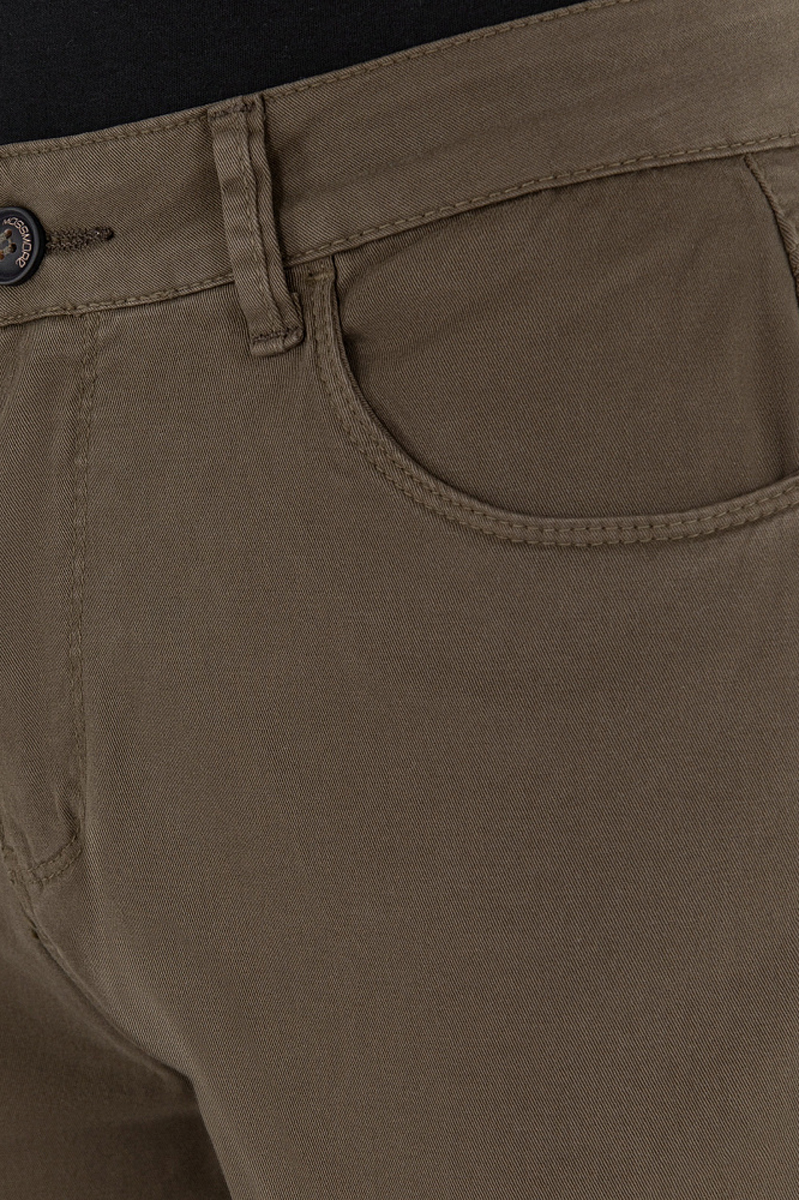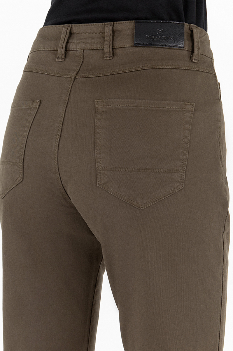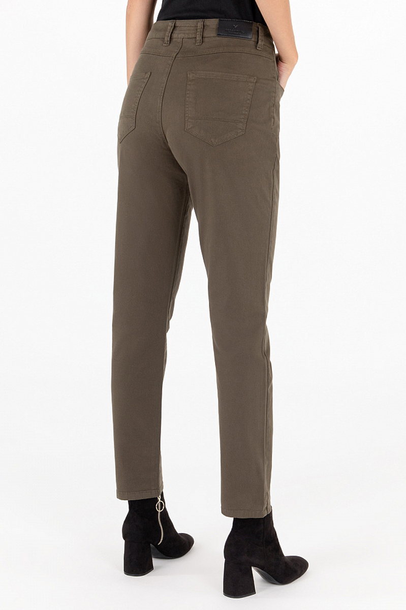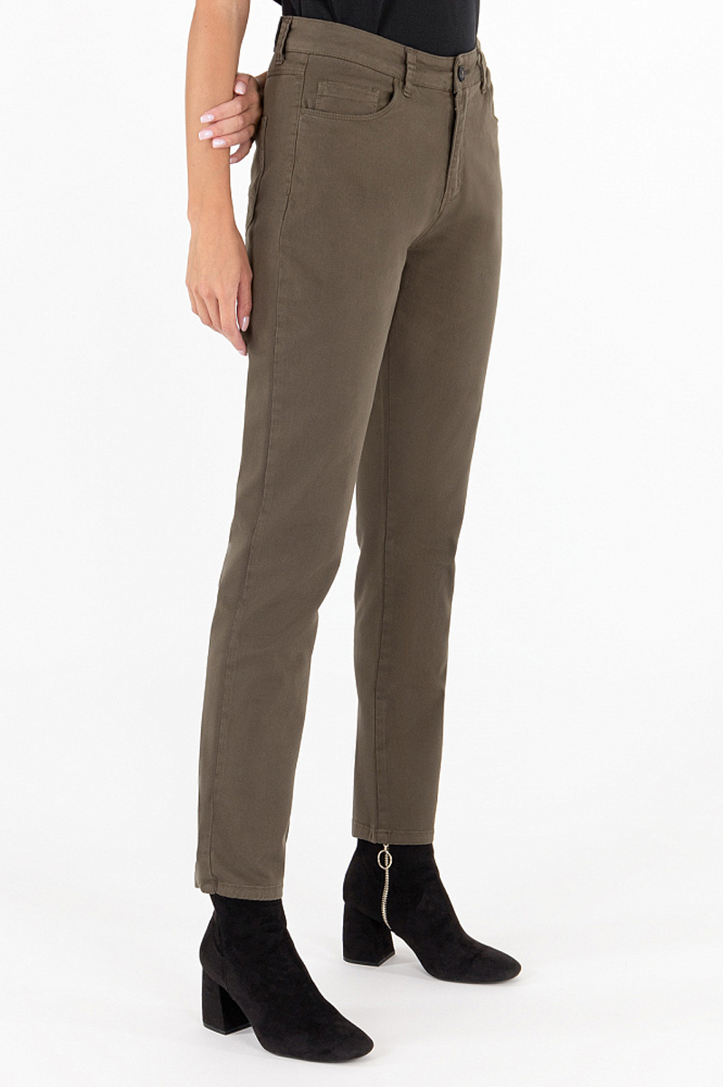 Женские брюки в стиле "бойфренд" цвета хаки. Прекрасная альтернатива классическим офисным брюкам. Брюки выполнены из хлопка с добавлением небольшого количества эластана. Брюки имеют очень интересную фактуру, которую приятно рассматривать и трогать. Базовая модель с удобными карманами и шлёвками для ремня. В качестве обуви можно выбрать лоферы или короткие сапожки.