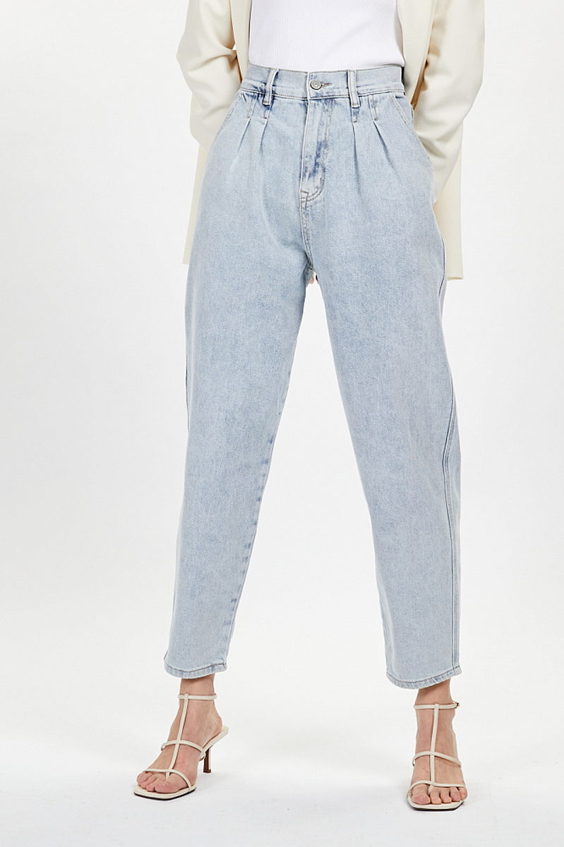Свободные джинсы синего цвета кроя Balon, сужающиеся книзу. Передние прорезные карманы-хулиган, защипы спереди и задние накладные карманы. Плотность 11,5 oz. Застежка: молния, пуговица. Параметры модели: 82-60-90. Посадка: высокая.