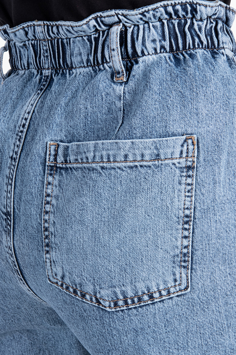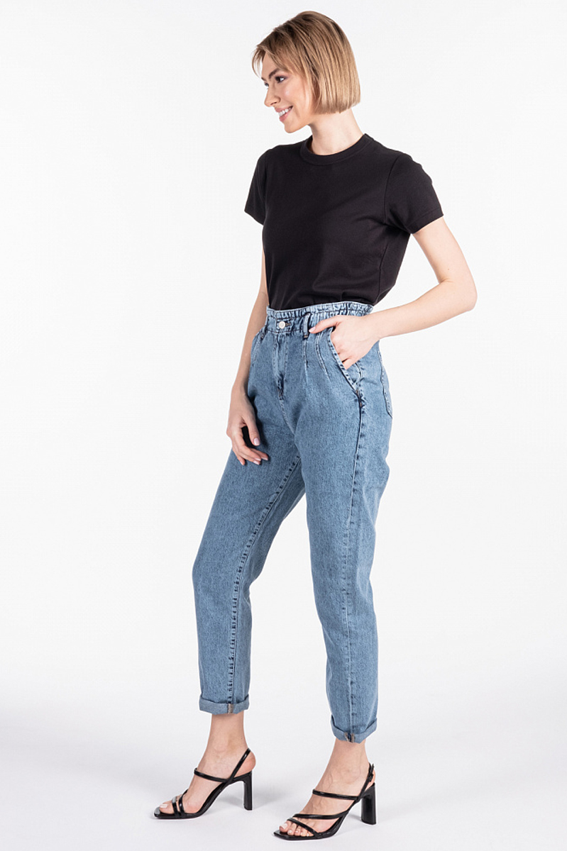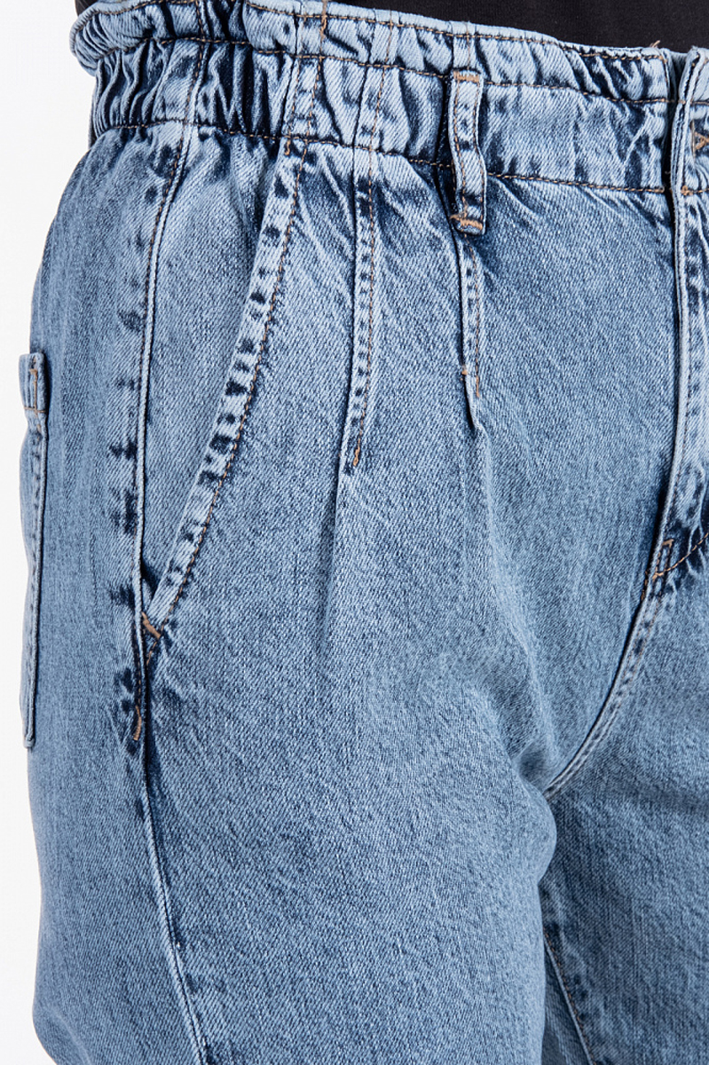 Свободные джинсы синего цвета кроя Balon, сужающиеся книзу. Передние прорезные карманы-хулиган, защипы спереди, пояс на резинке и задние накладные карманы Застежка: молния, пуговица. Параметры модели: 88-64-93. Посадка: высокая.