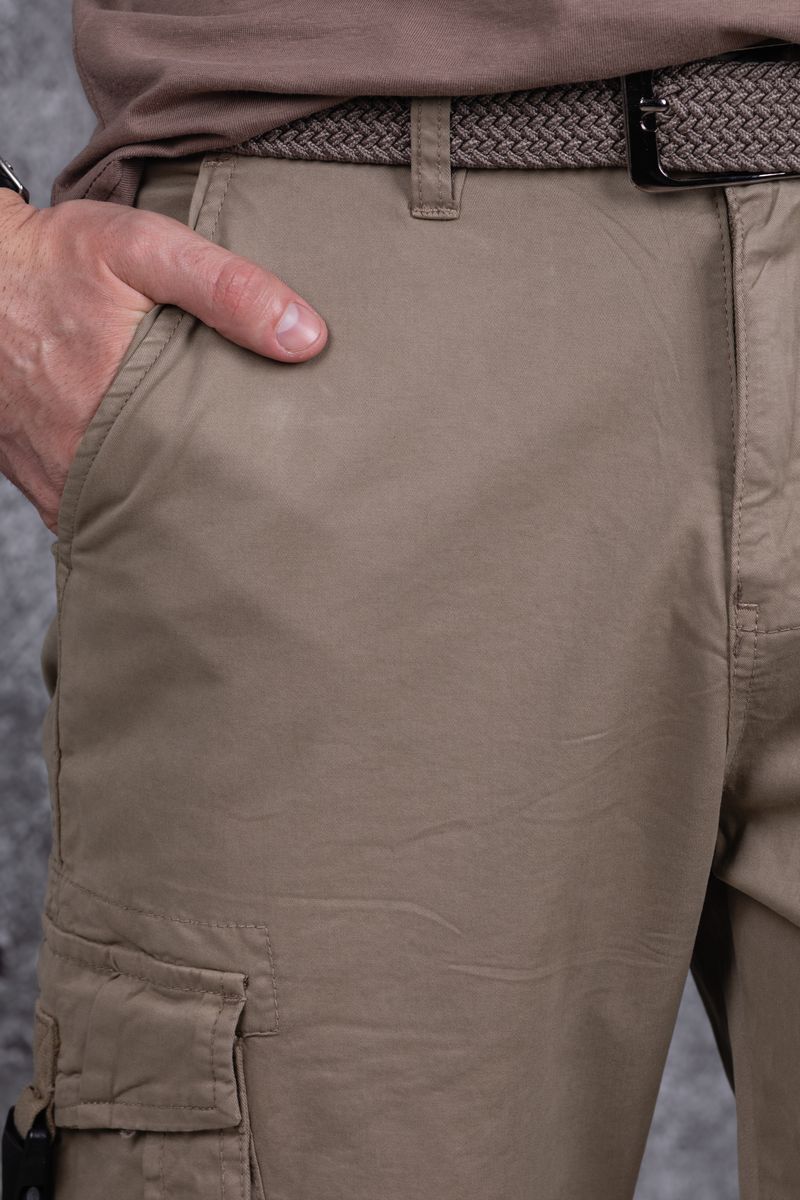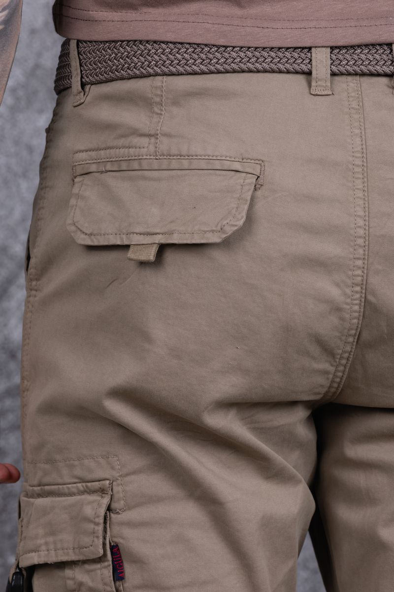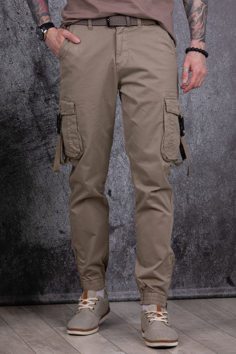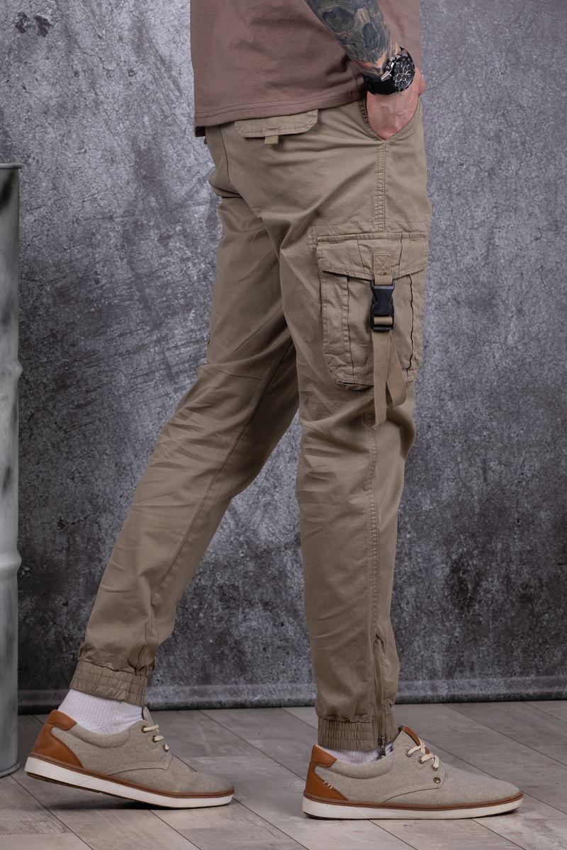Джоггеры бренда AIGULA с заниженной линией шага из натуральной хлопковой ткани с добавлением небольшого количества эластана. Джоггеры с множеством карманов. Боковые карманы с декоративным замком-пряжкой на ленте. Низ брюк отделан эластичными манжетами.