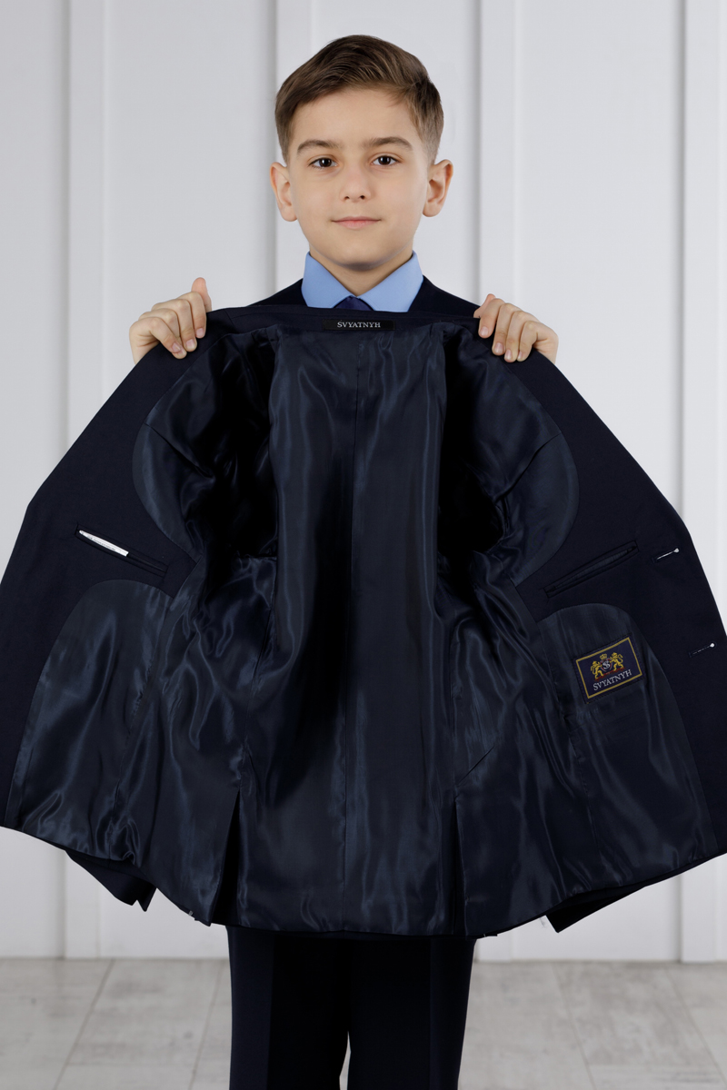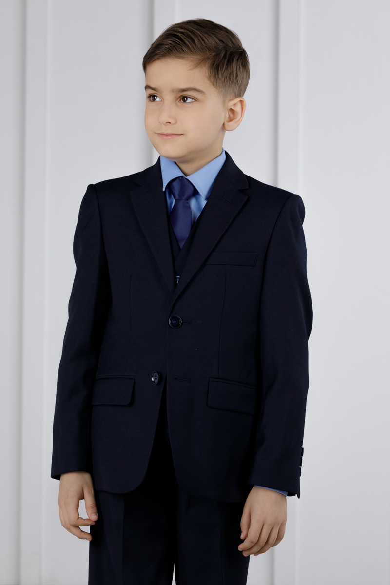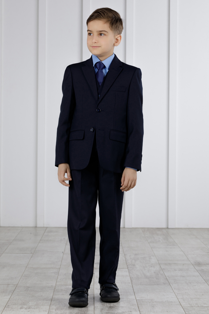 Детский классический демисезонный костюм-двойка от Svyatnyh (Россия) для школы и праздников. Приталенный пиджак с двумя шлицами и прорезными карманами с клапанами, зауженные брюки со стрелками. Качественная ткань сохраняет форму, брюки легко подшить по росту.• Артикул: 5088-Р97.2 костюм детский