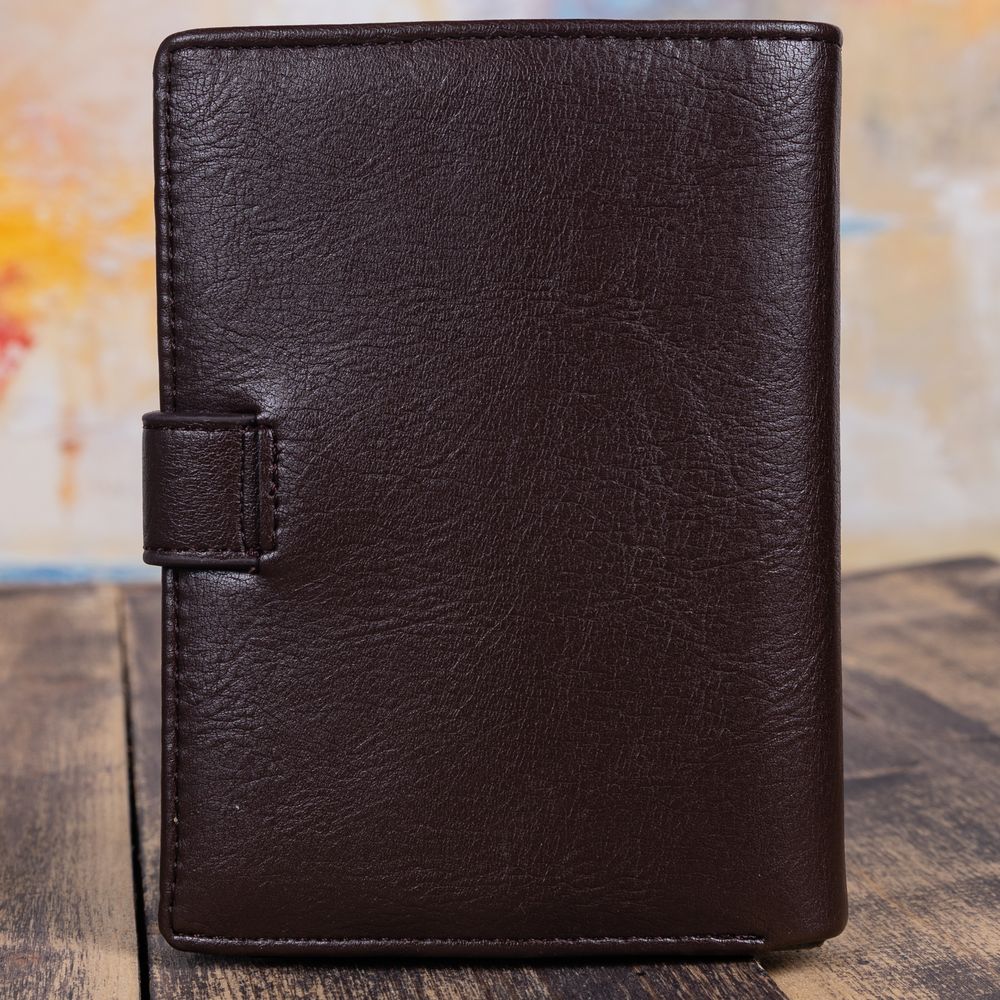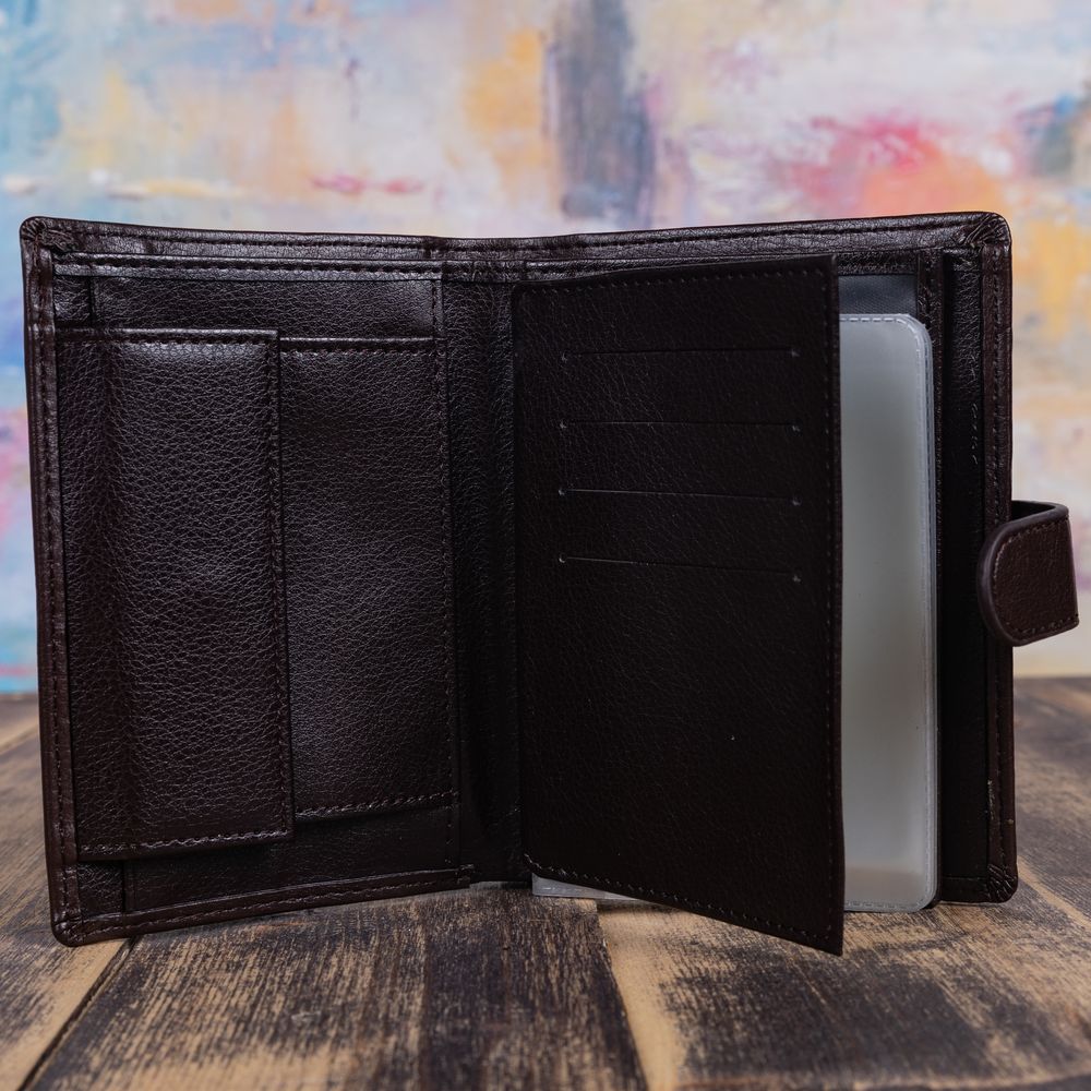 Тип застежки: кнопка Обложка для документов Многофункциональная обложка с кошельком выполнена из эко-кожи, закрывается на кнопку. Наполнение обложки: - 2 отделения для купюр любого достоинства, и 1 скрытый отдел на молнии, - 1 карман для монет на кнопке, - 4 кармана для пластиковых карт, - 1 вертикальный карман размером: 115*75 мм, - обложка с ПВХ вкладышем для водительских документов, блок из шести матовых файлов, один из которых формата А-5, два боковых кармана, - обложка для паспорта.