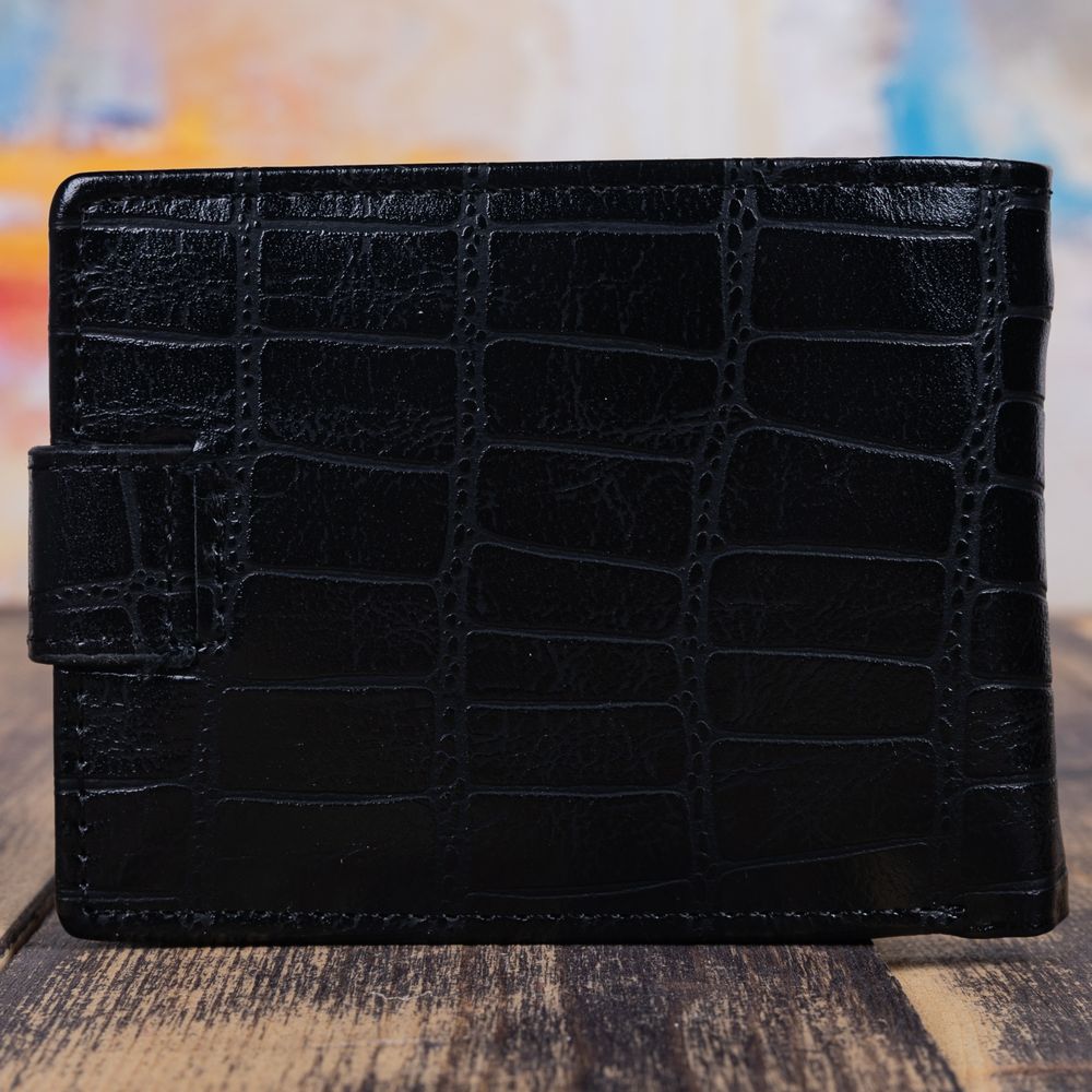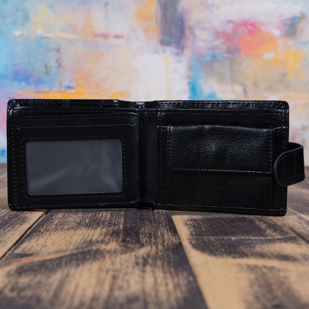 Тип застежки: кнопка Мужское портмоне из эко-кожи Наполнение портмоне: - 3 кармана для пластиковых карт, - 2 кармана с прозрачным пластиковым "окошком", - 1 карман на кнопке для монет, - 2 больших отделения для купюр любого достоинства, и 1 скрытый карман на молнии, - 2 скрытых кармана для пластиковых карт.