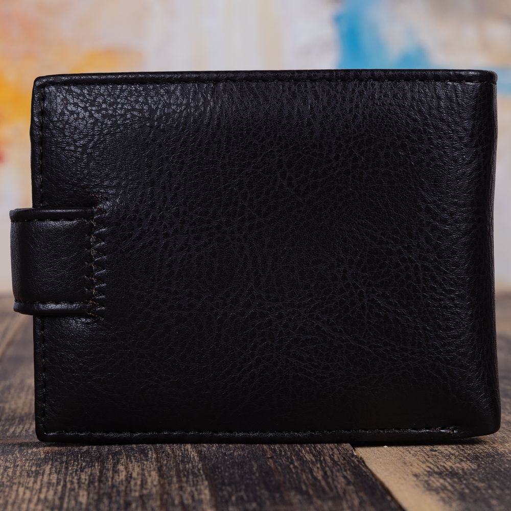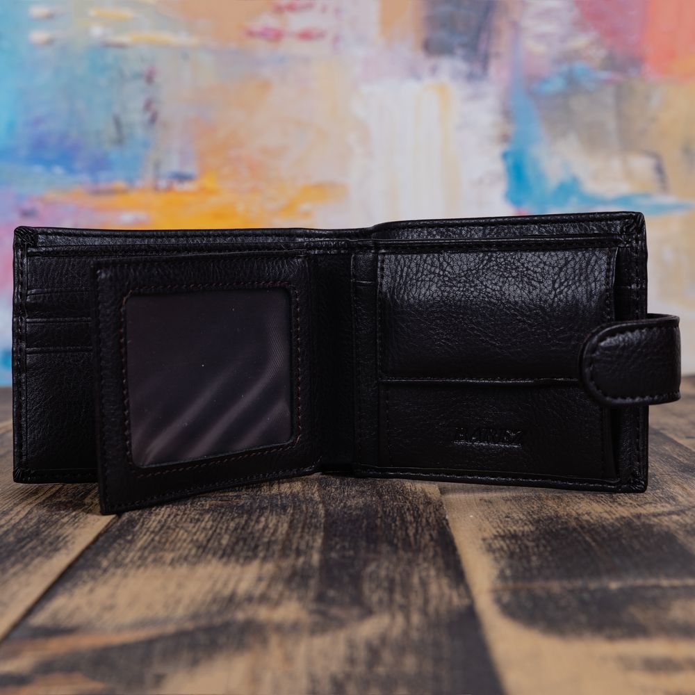 Тип застежки: кнопка Портмоне мужское Изделие выполнено из эко-кожи, закрывается на кнопку. Наполнение портмоне: - 3 кармана под пластиковые карточки, - 1 двухстороннее отделение с окошком, - 1 карман для мелочи на кнопке, - 2 отдела для купюр любого достоинства и 1 скрытый отдел на молнии.