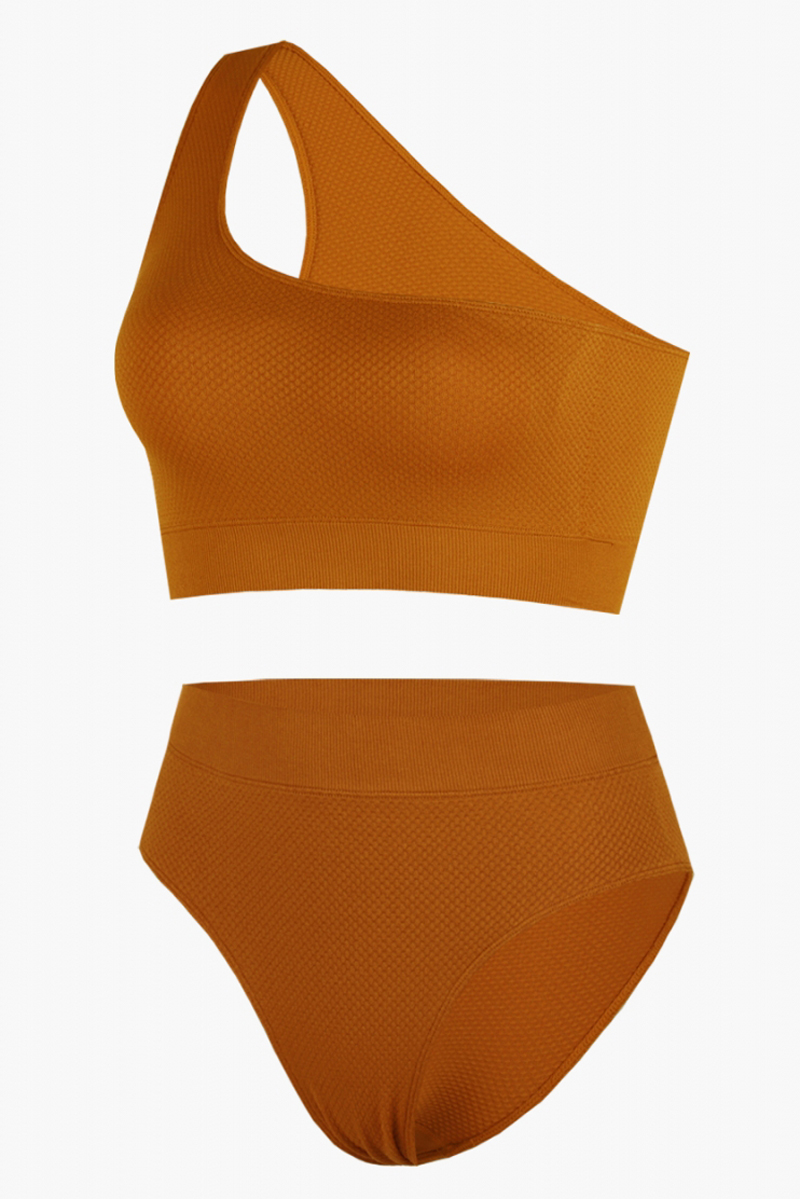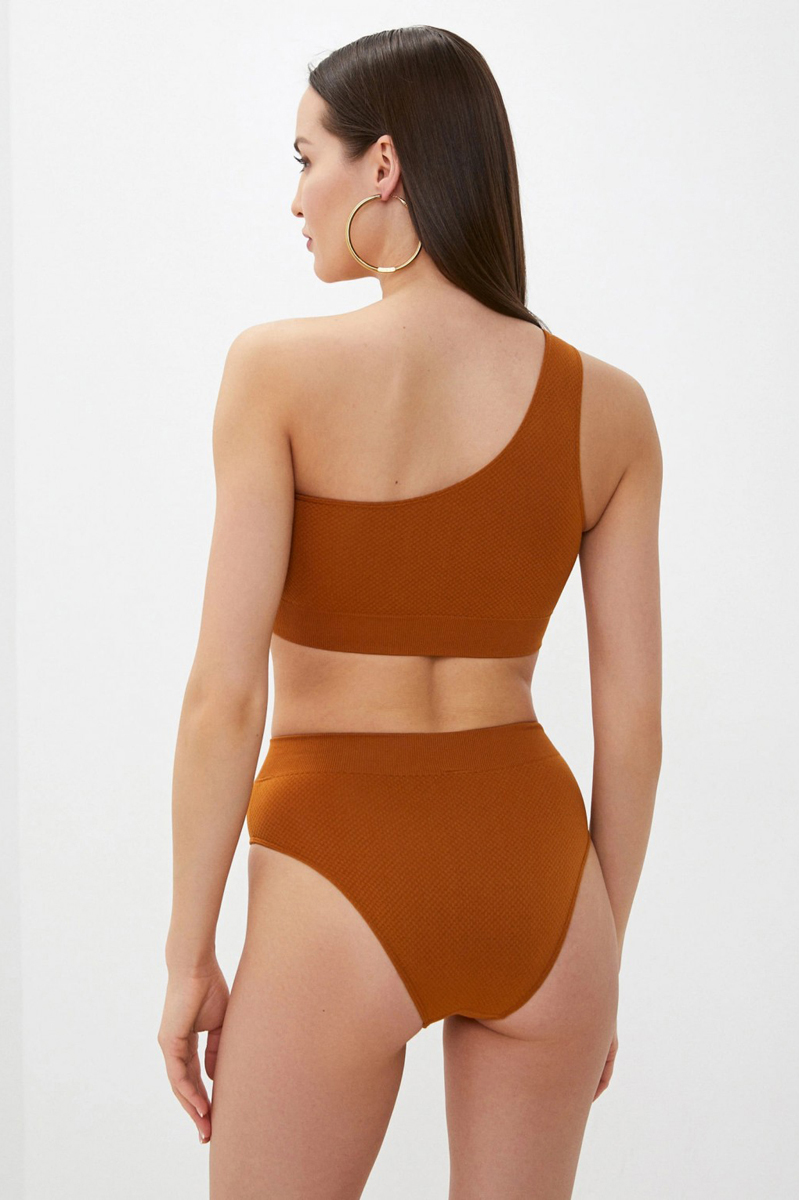 Раздельный купальник от торговой марки Индефини. В комплекте бюстгальтер с плавками. Бюстгальтер-топ из полиамида, коричневого цвета, без косточек и без Push-up, со съемными подкладками, в рубчик, на широкой лямке, на мягкой резинке. Плавки из полиамида, коричневого цвета, в рубчик, с высокой посадкой, на мягкой резинке.