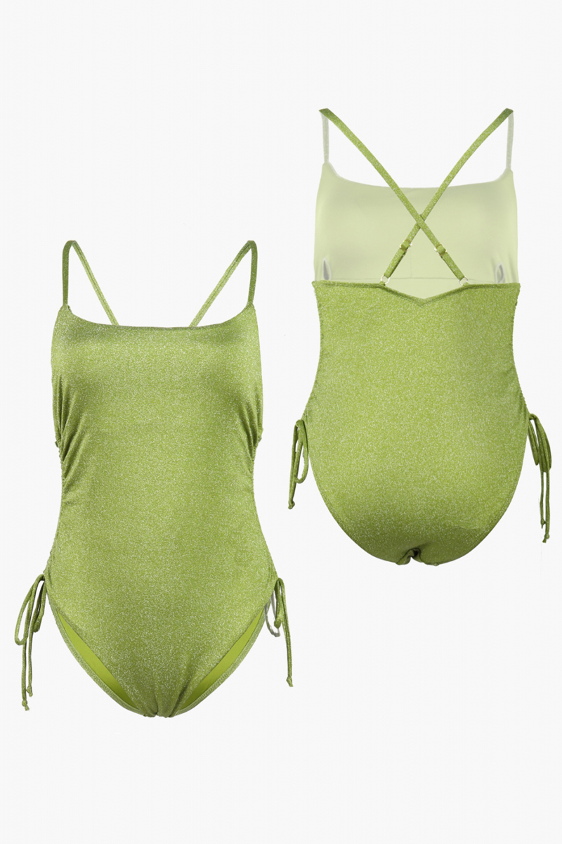 Слитный купальник от торговой марки Индефини. Купальник из полиамида, зеленого цвета, без косточек и без Push-up, со съемными подкладками, со сборками по бокам, на тонких регулируемых лямках.