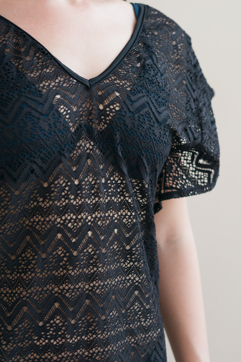 Пляжная туника от торговой марки Индефини. Туника из сетчатой ткани, с короткими рукавами, и с V-образными вырезами спереди и на спине.