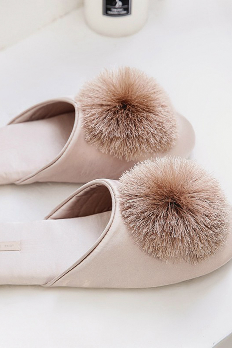 Простые и симпатичные текстильные тапочки с пушистым помпончиком сверху выполнены в спокойном бежевом цвете. Приятная округлая форма, легкая подошва, ровные аккуратные швы располагают к себе и привлекают внимание к данному изделию. Хороший вариант для домашней обуви, которая подойдет ко всему!