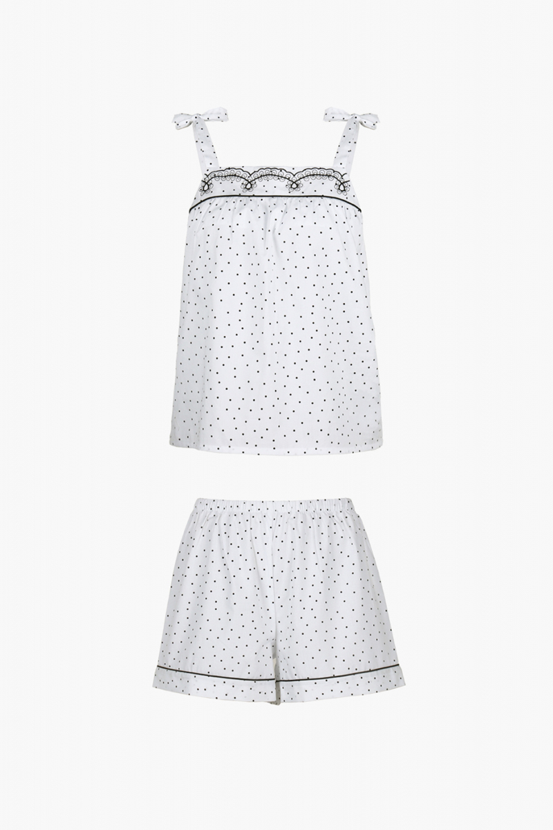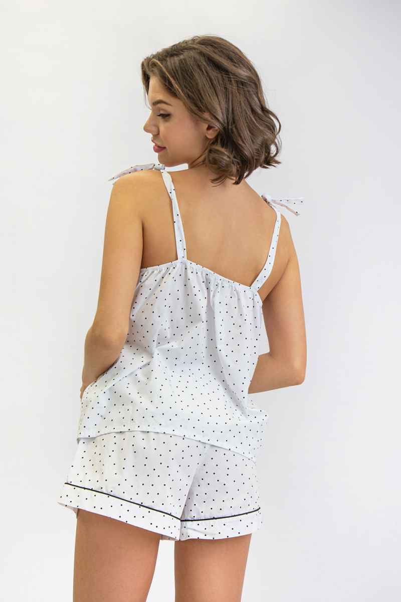 Комплект домашней одежды от торговой марки Индефини. В комплекте майка-топ и шорты. Майка-топ из хлопка, белого цвета в горошек, без рукавов, с бантиками на лямках, высота лямок регулируется завязкой бантиков. Шорты из хлопка, белого цвета в горошек.