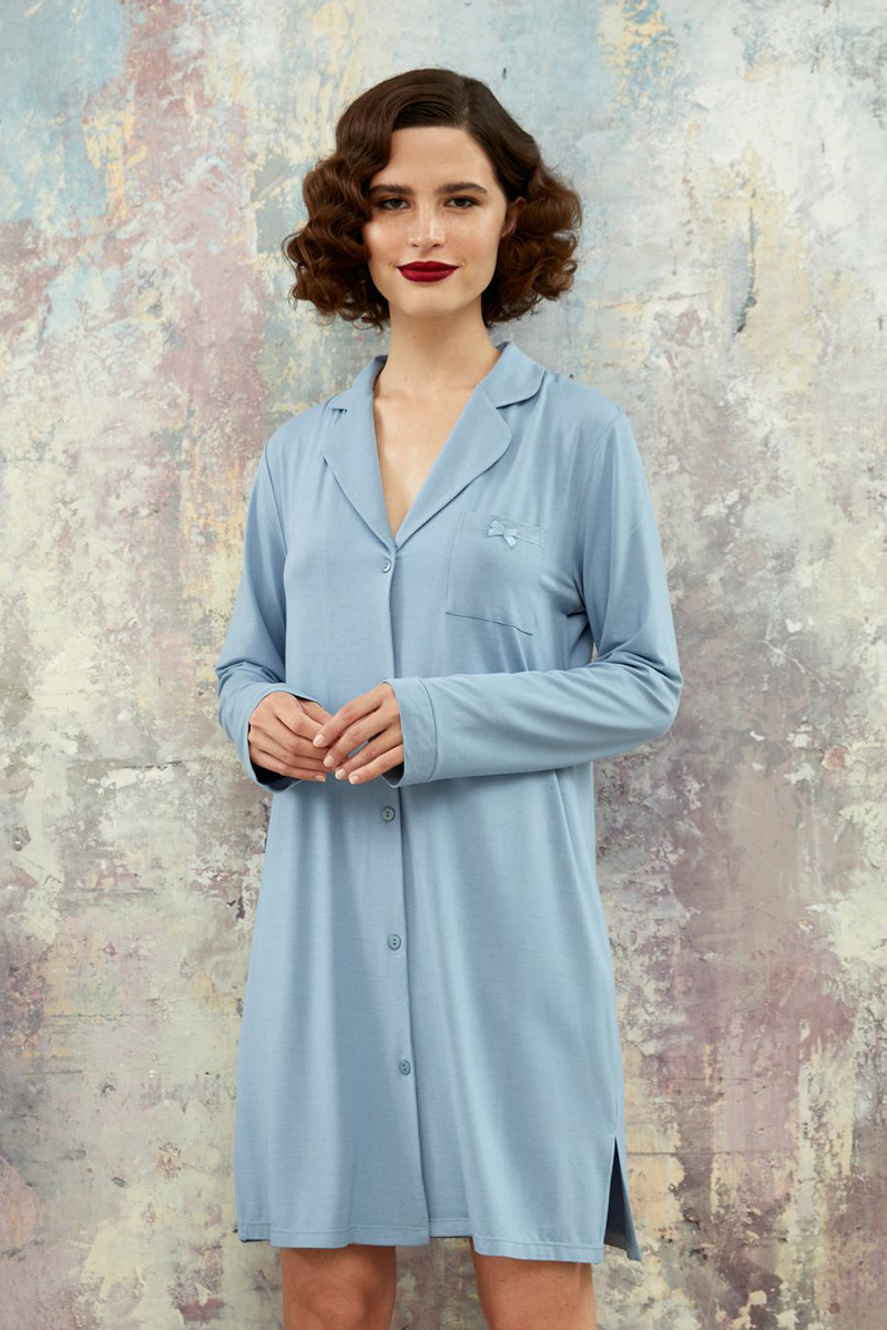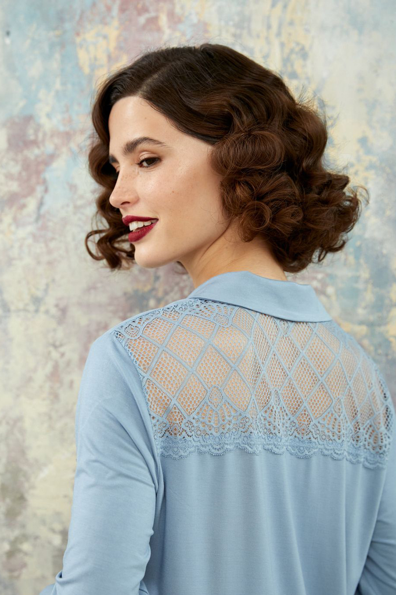 Халат прямого силуэта длиной за колено и длинным рукавом. Центральная застежка на пуговицы переходит в отложной воротник с округлыми краями. На левой полочке нагрудный накладной карман, на спинкекокетка из ажурного кружева. По бокам невысокие разрезы.