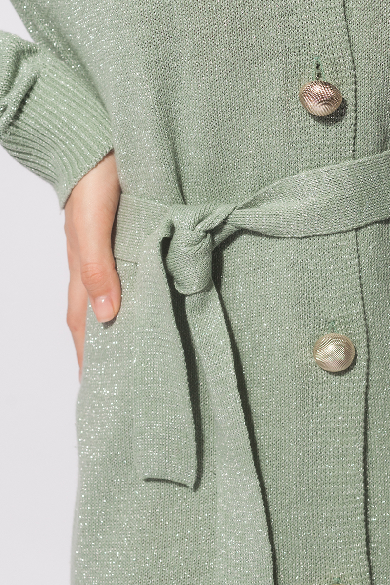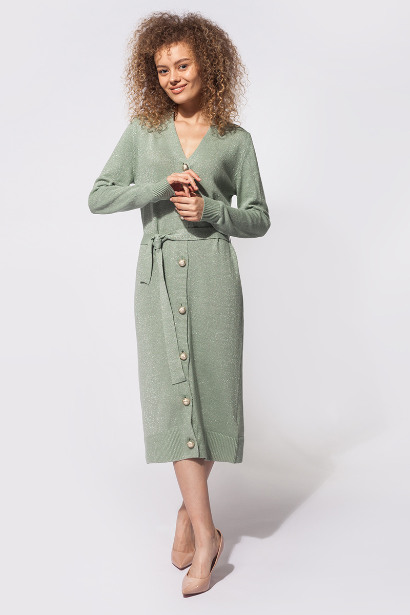 Эффектное платье-кардиган с добавлением серебряного люрекса. Облегающий крой подчеркивает фигуру. Модель имеет удлиненные рукава, V-образный вырез горловины и застежку на акцентные золотые пуговицы. Трикотаж и удлиненные рукава – тренды FW’21/22 по версии Vogue.