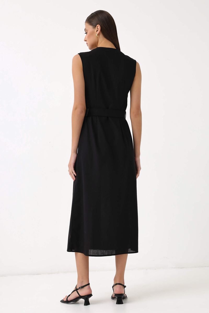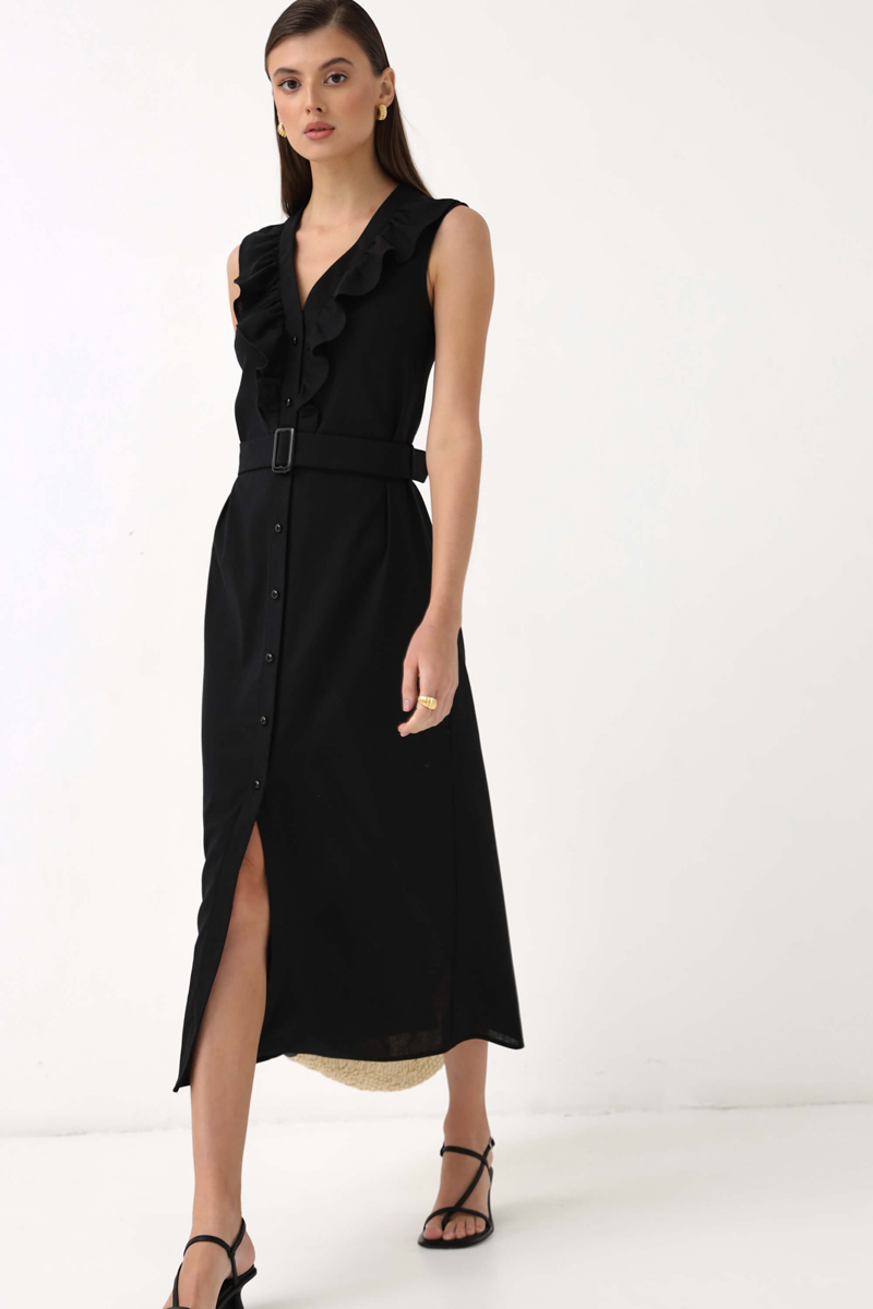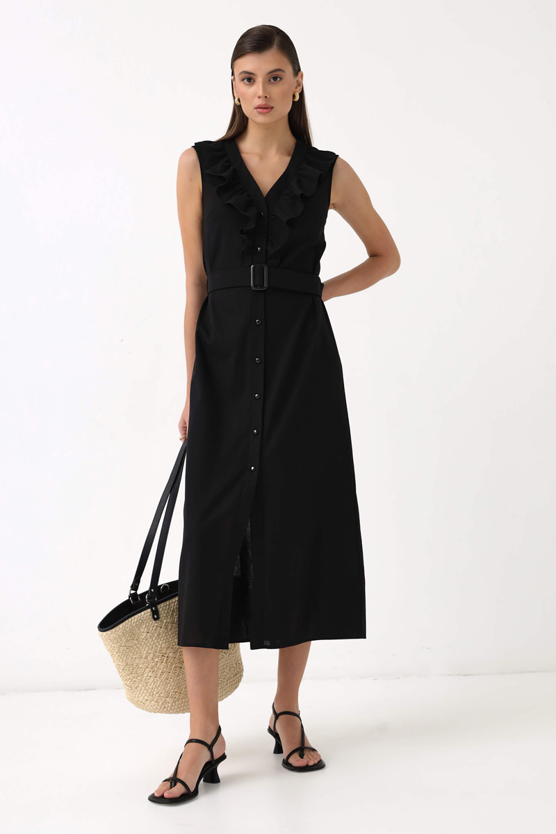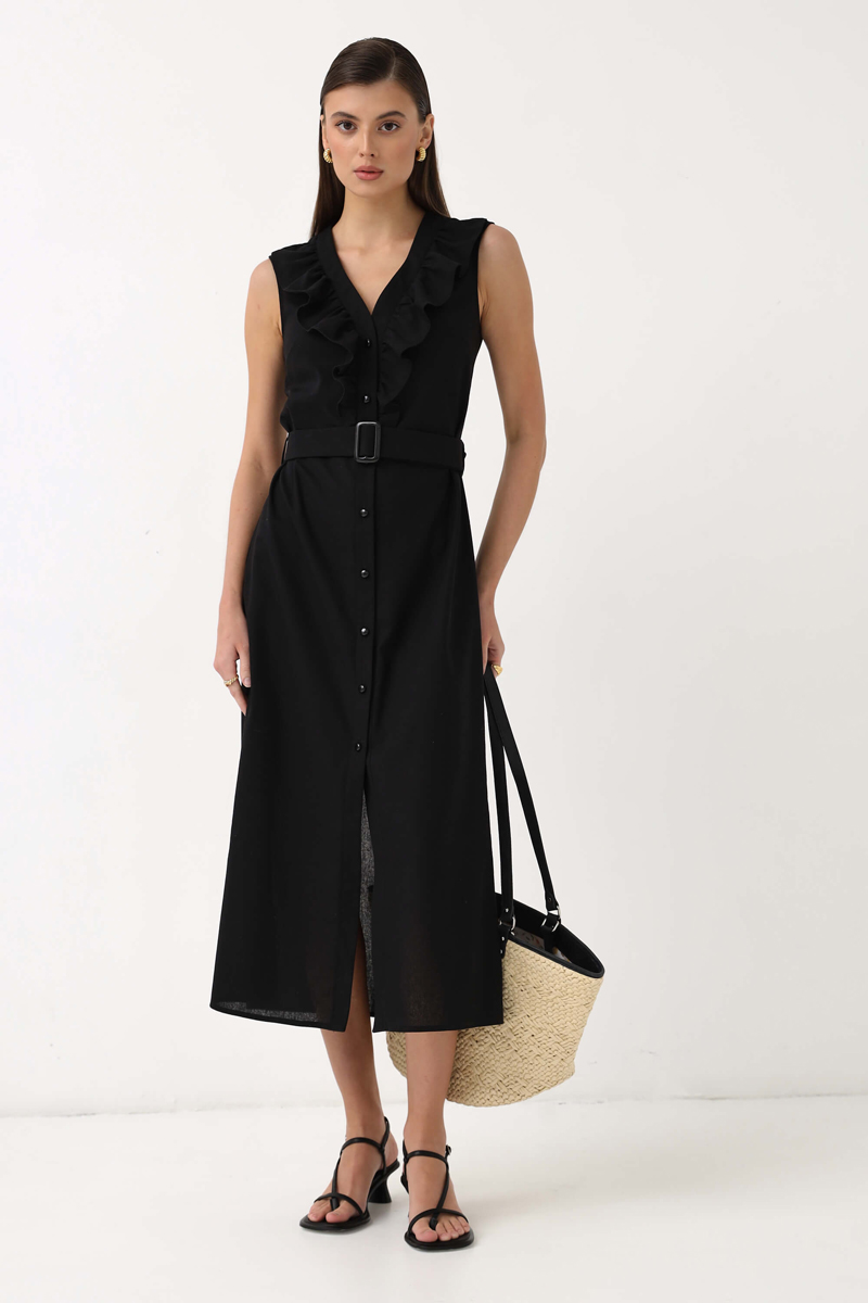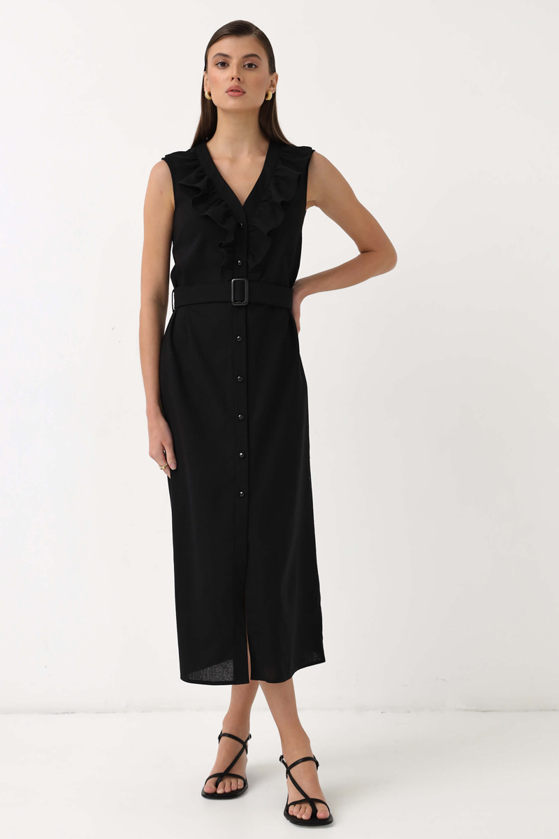 Женственное платье из высококачественного льна. Модель полуприлегающего силуэта. По переду рюша до линии талии, планка с функциональной застежкой на акцентные пуговицы. В комплекте пояс из основной ткани и пряжкой в тон пуговицам. Силуэт: Полуприлегающий. Длина: 125см.
