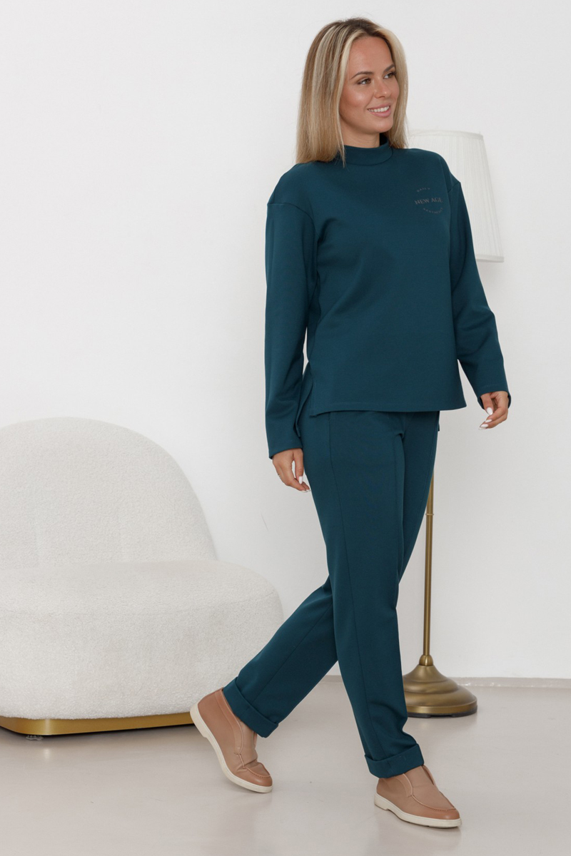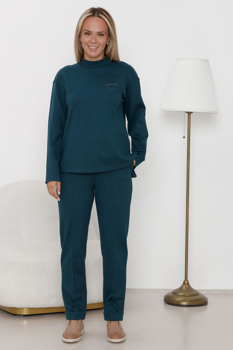 Свободный, прямой. Спущенный прямой рукав, горловинка-стойка. Из плотного мягкого вискозного джерси. Слева печать «new age». Внимание! Свитшот (артикул 71.8-22,403) можно приобрести только в комплекте с брюками (артикул 71.2-624,403)