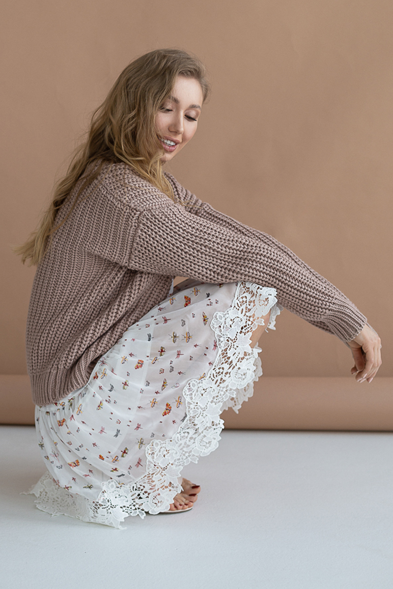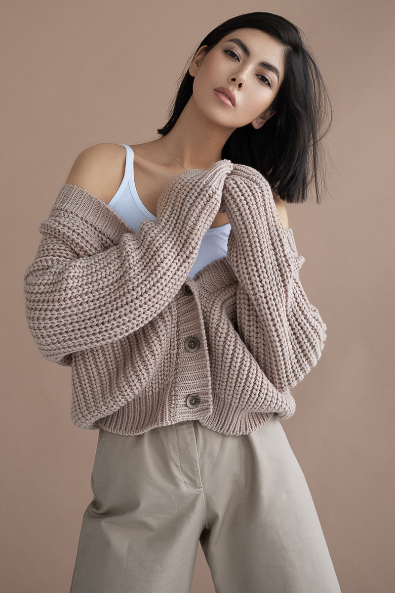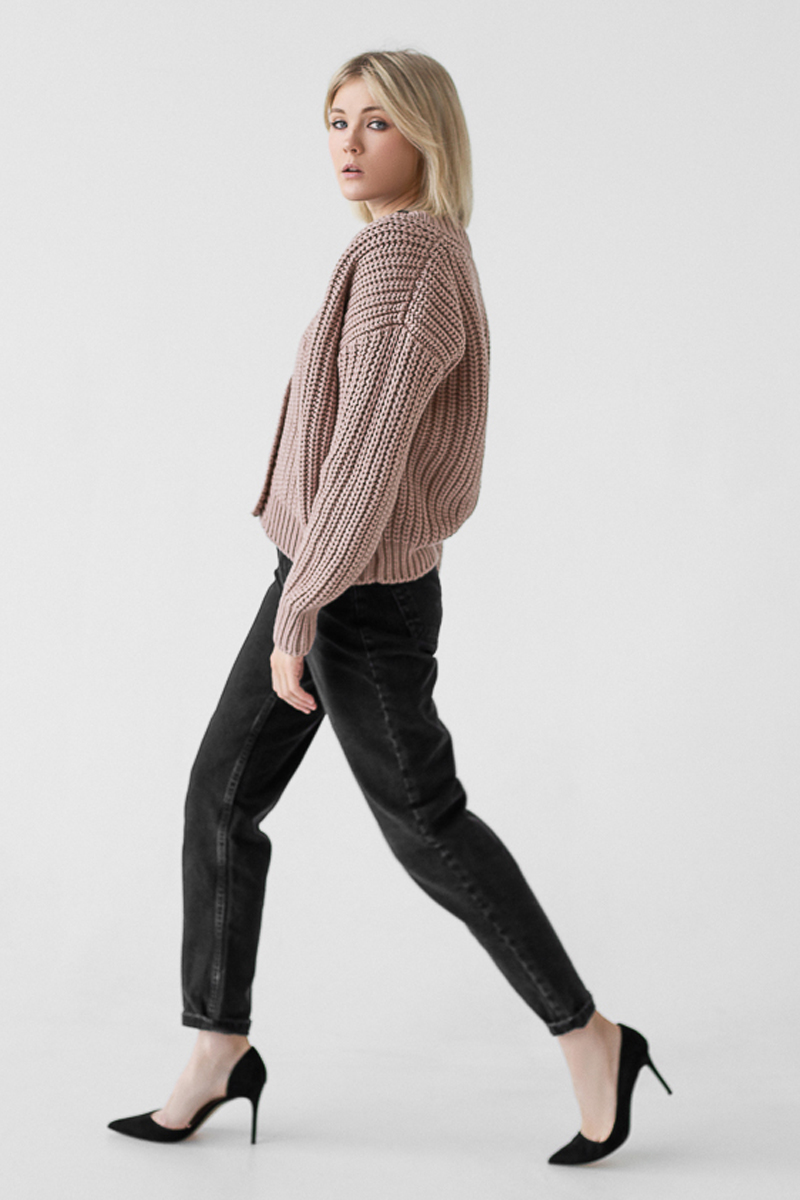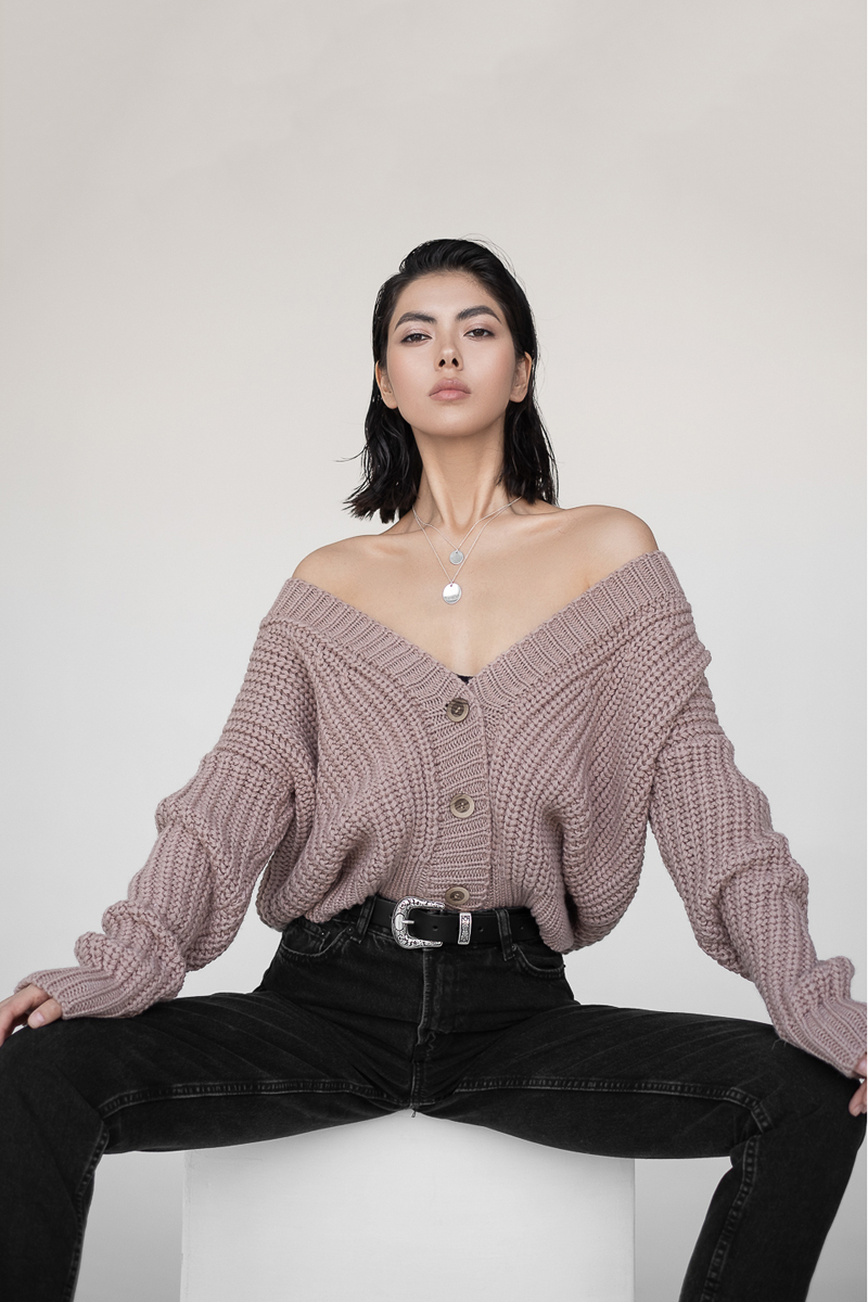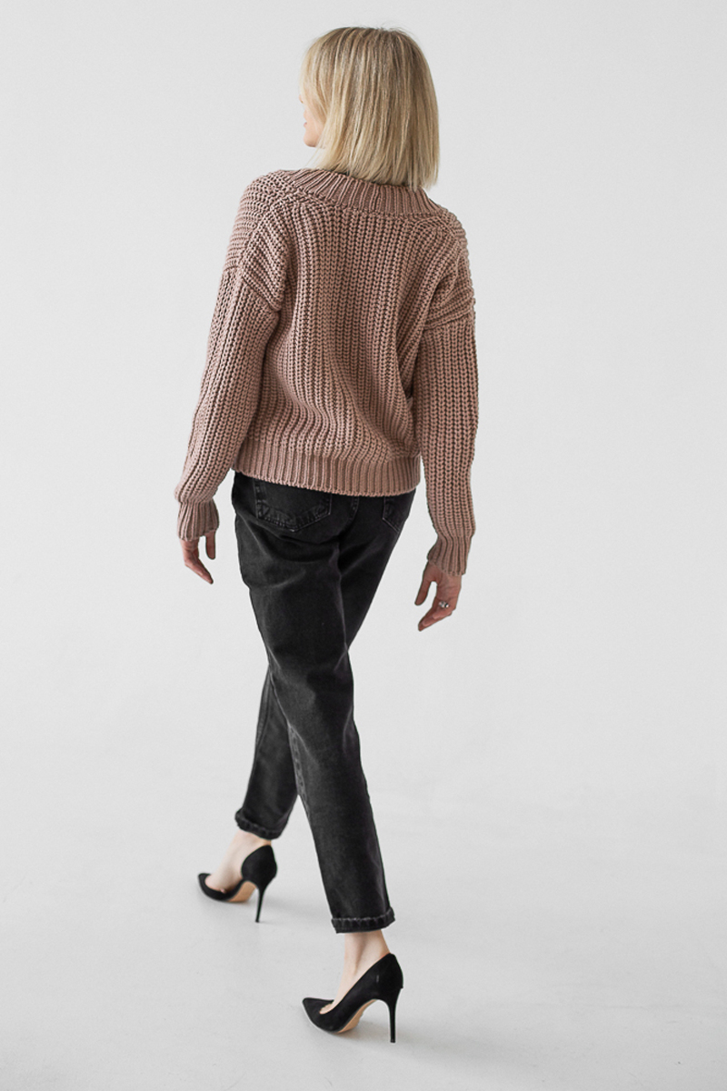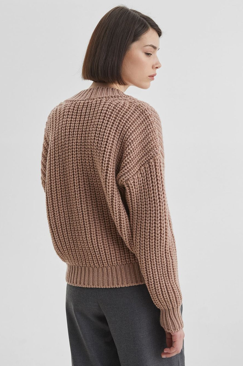 Оверсайз крой; Английская резинка; Крупная вязка 3 класса; Укороченная длина; Стандартная длина рукава; Спущенное плечо; Мягкий и теплый. Длина: 56 см. Ширина: 57 см. Рукав: 72 см. Обмеры изделий могут отличаться от заявленных: +/- 3 см.