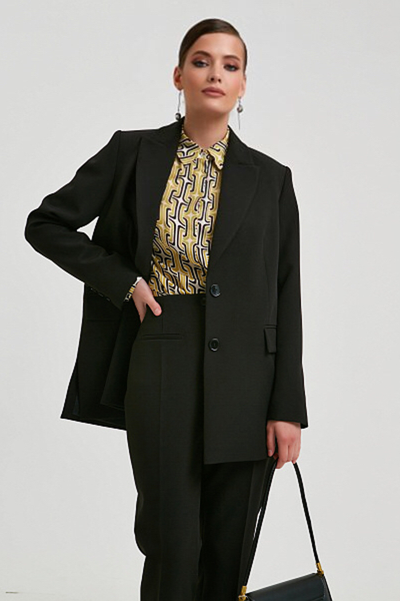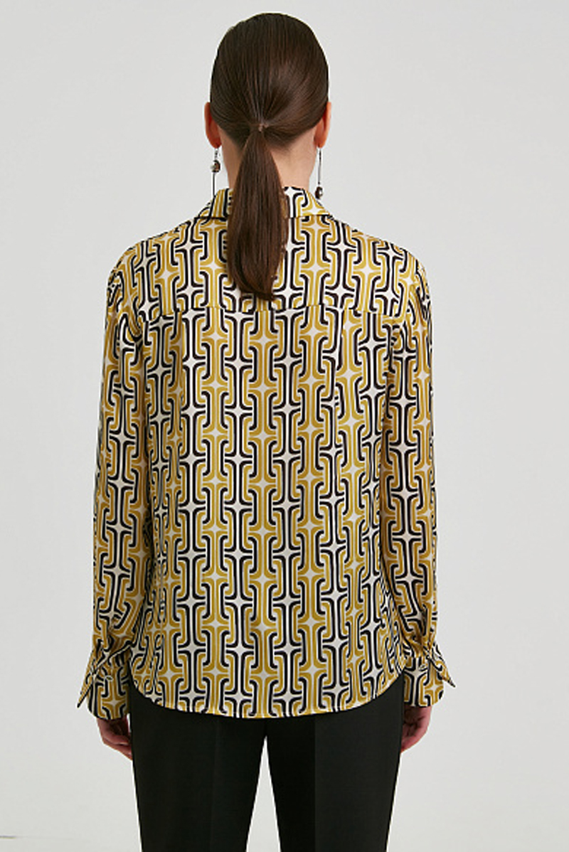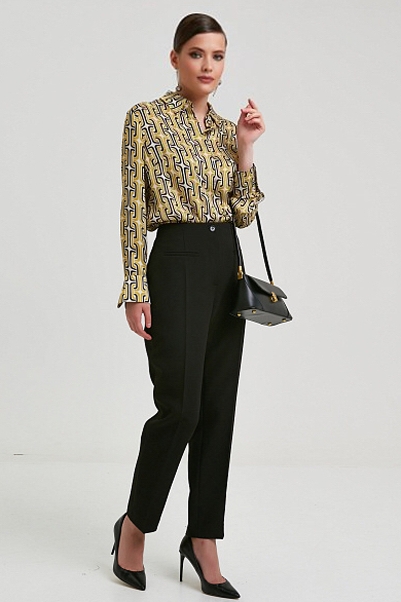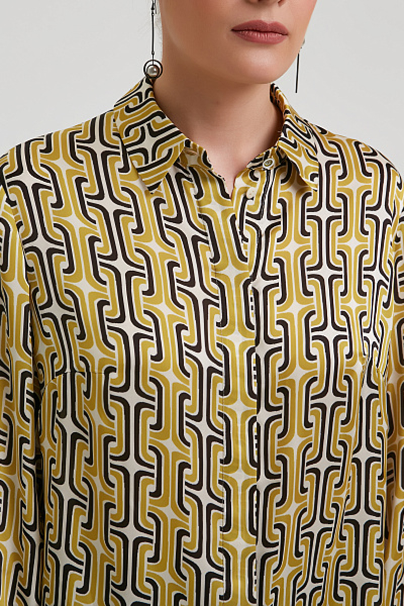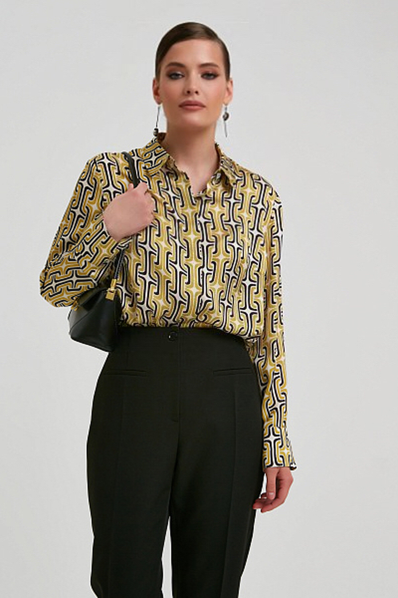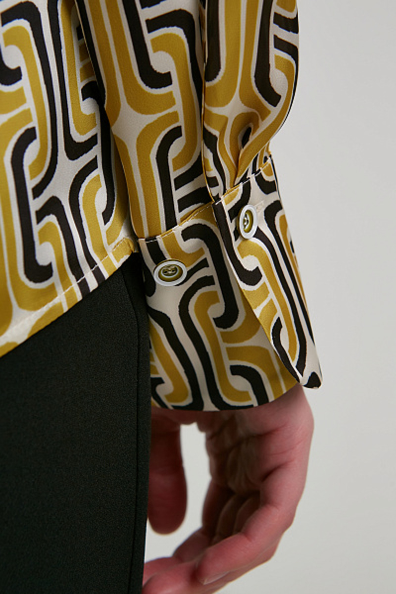 Блузка с принтом. Спереди потайная застёжка на петли и пуговицы. Спинка с кокеткой. Под кокеткой защипы. Воротник сорочечный. По низу рукава разрез, защип и фигурная манжета с застёжкой на пуговицу. Низ блузки закруглён.