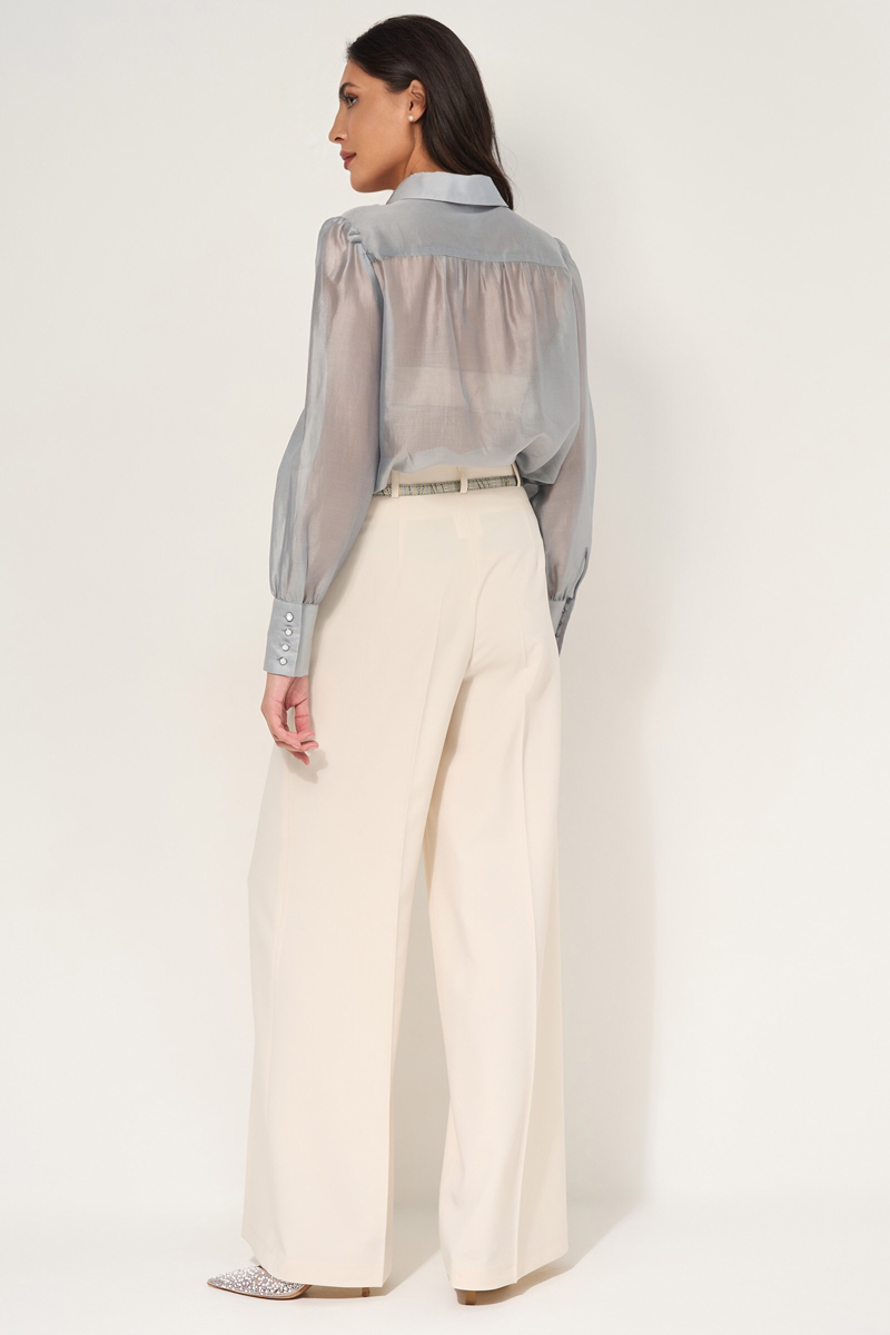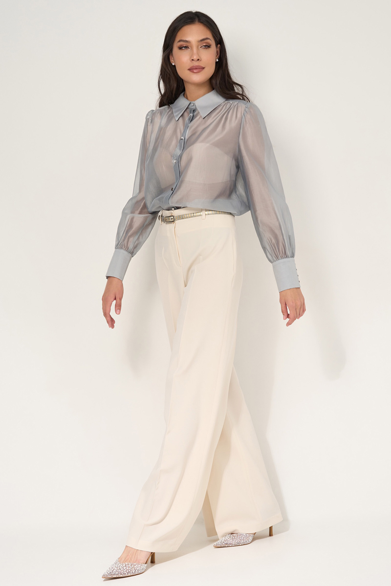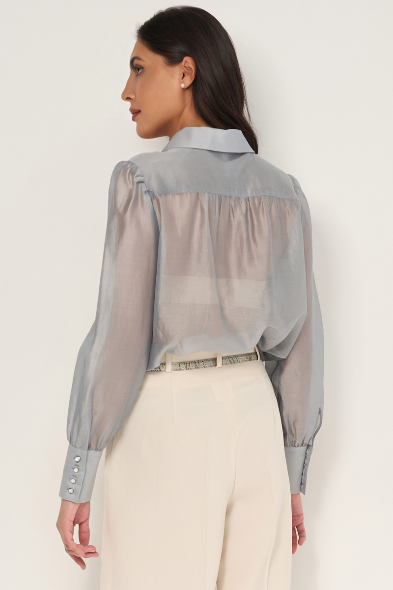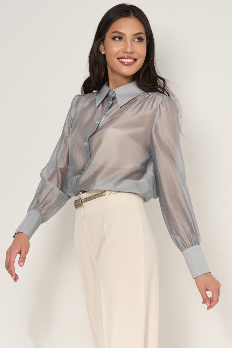 Блузка из нежного дымчато-прозрачного шифонового тенсела, сборка по окату рукава, рубашечная застежка. Длина: 64 см.