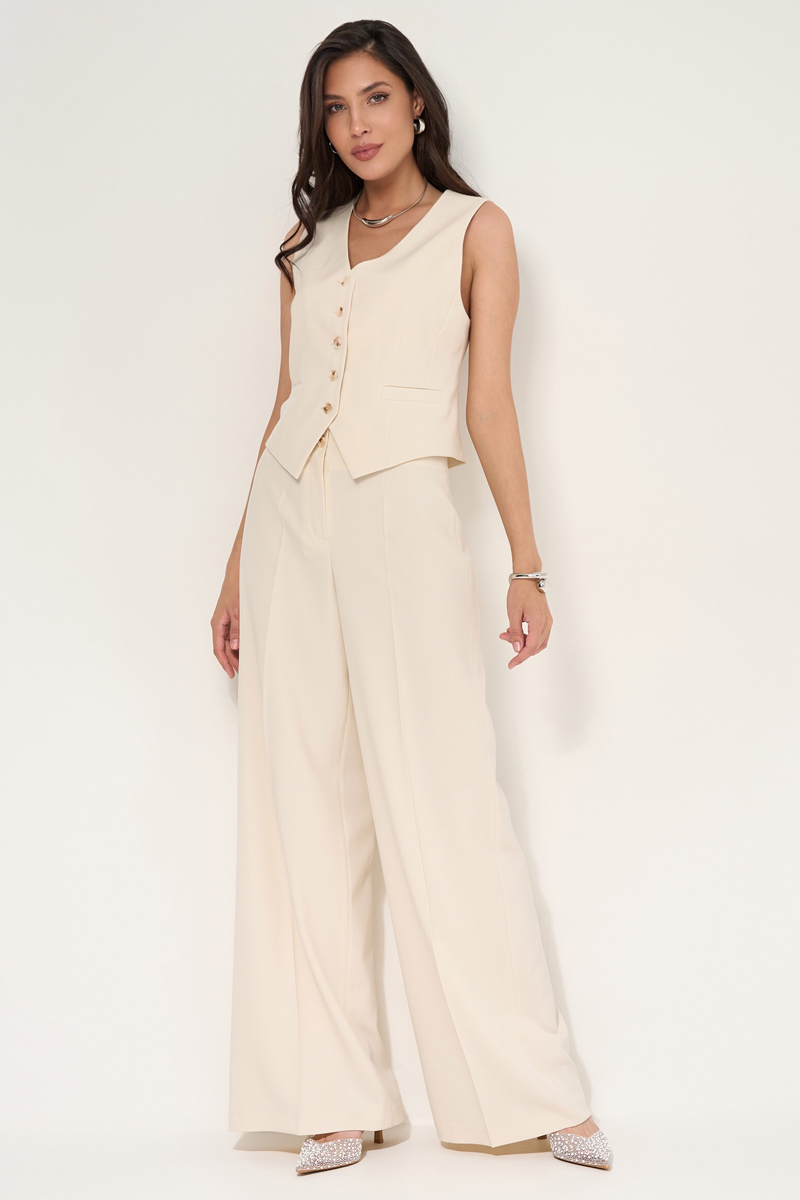 Брюки расклешенные свободные, с завышенной силуэтной талией. Из средней по плотности смесовой гладкой костюмной ткани. Объем: Умеренный. Пояс: на обтачке. Силуэт: Расклешенные. Талия: завышенная. Длина: 112 см.