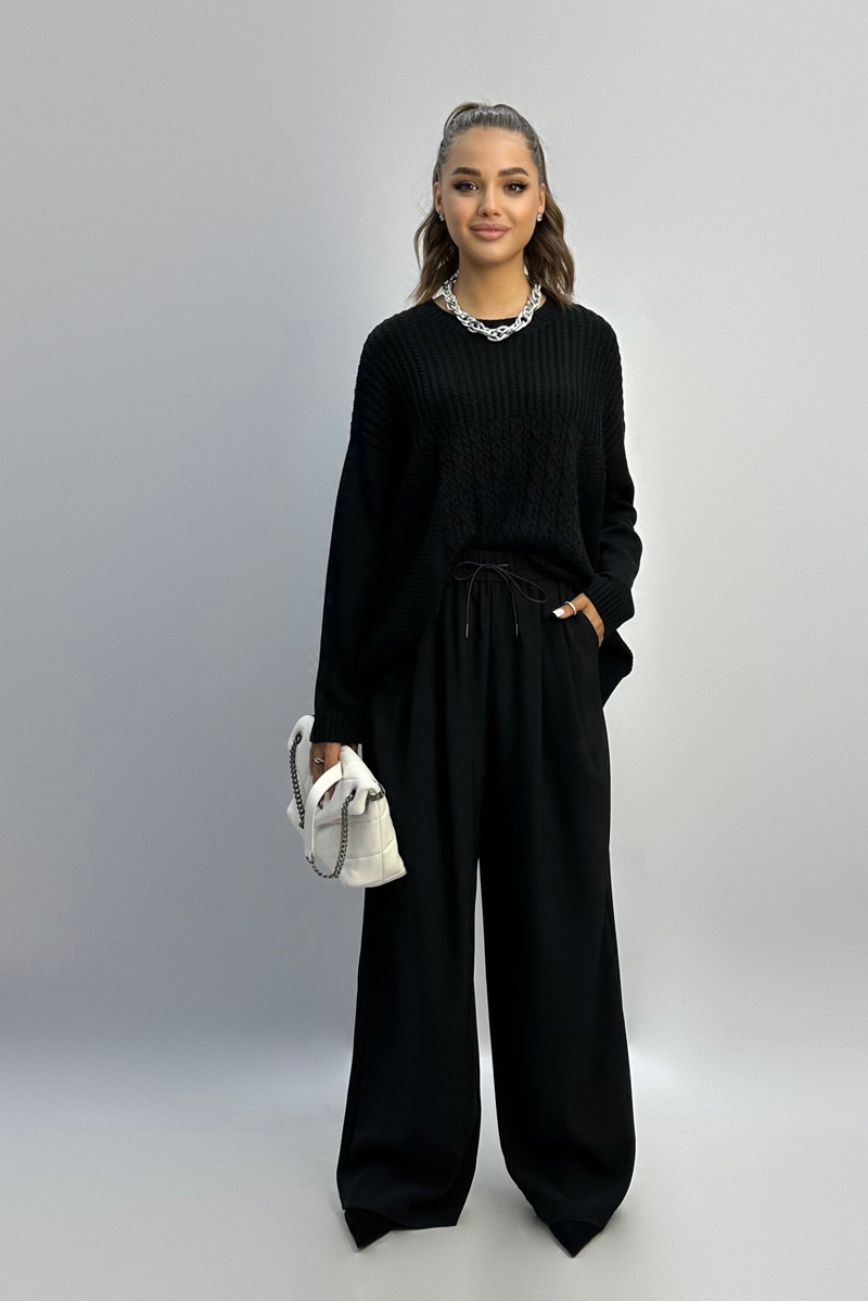 Максимально комфортная версия базовых брюк, где классический пояс заменен эластичным, а стрелки-произвольными складками по всей длине.