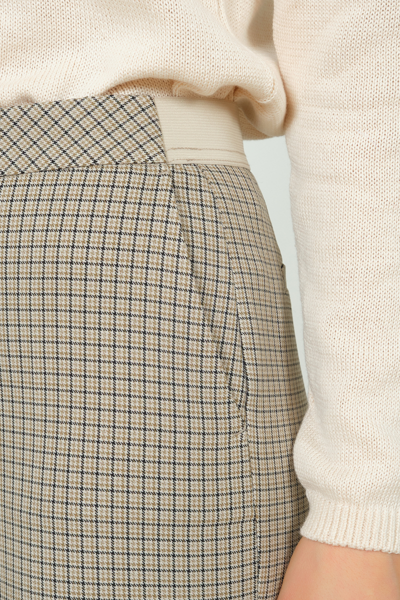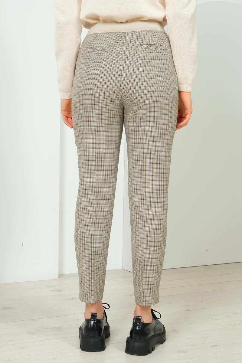 Брюки в клетку. Пояс комбинированный, спереди подкройной из основной ткани, сзади из резины. Спереди карманы в подрезных бочках, сзади имитация прорезных карманов с листочкой. Снизу в боковых швах небольшие разрезы. Подклад: Нет. Карманы: В подрезных бочках. Застежка: Молния, крючки на поясе. Длина изделия в росте: 164: 42р - 99см, 52р - 100см.