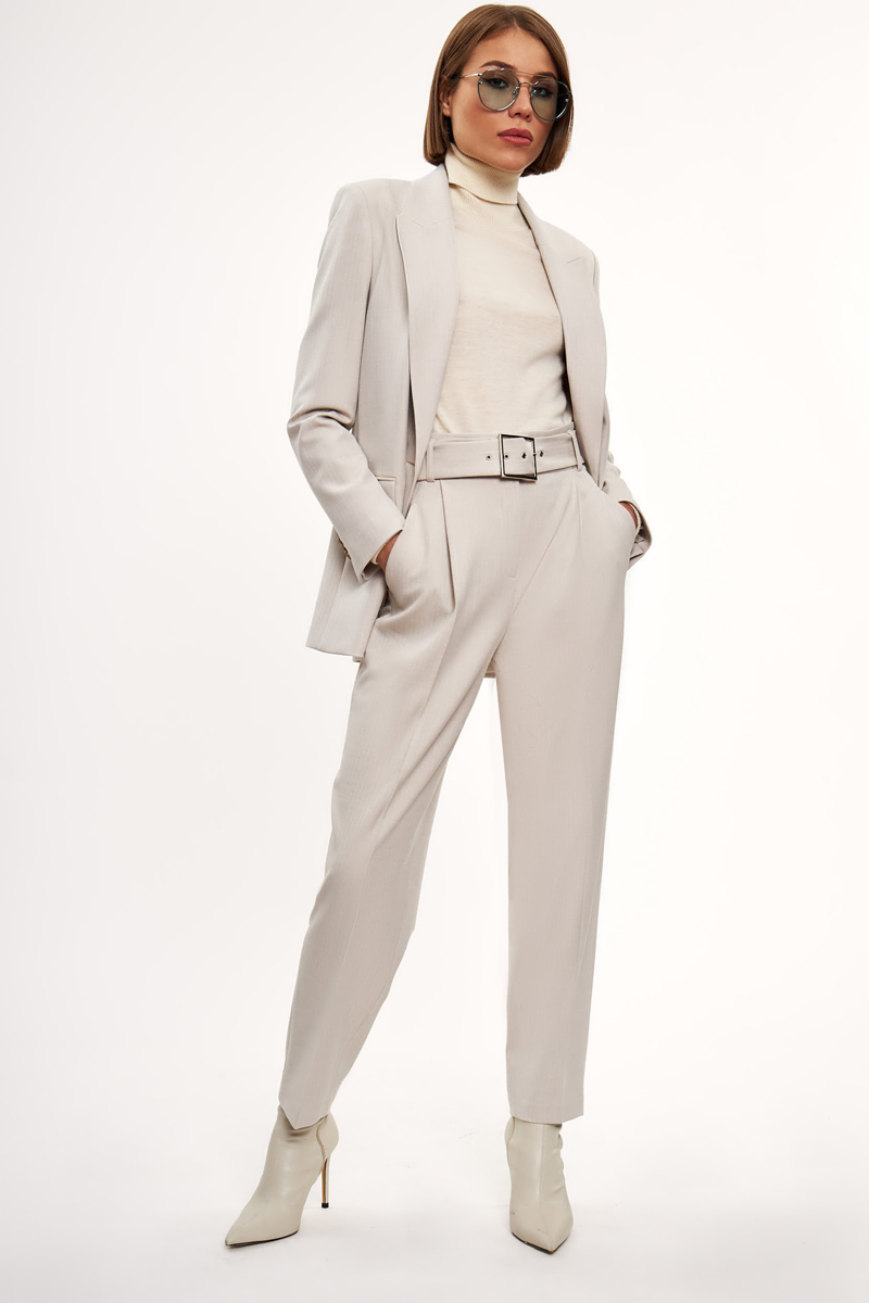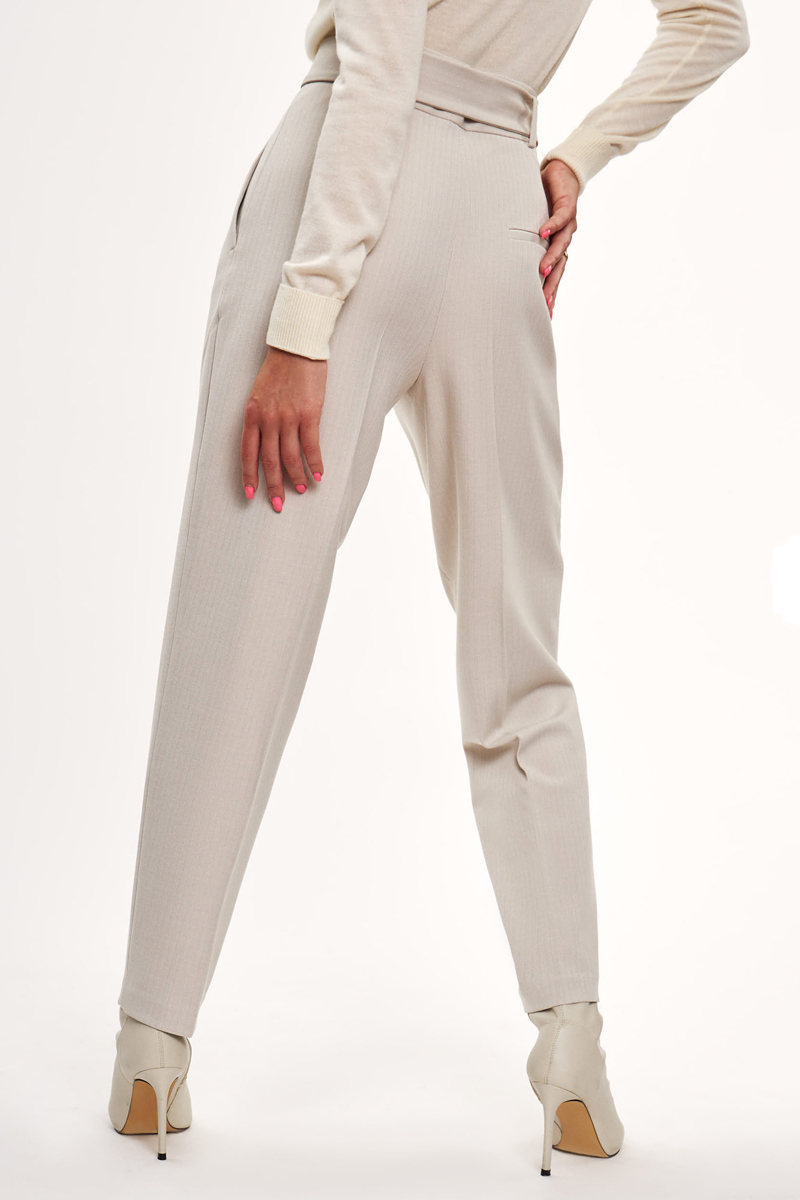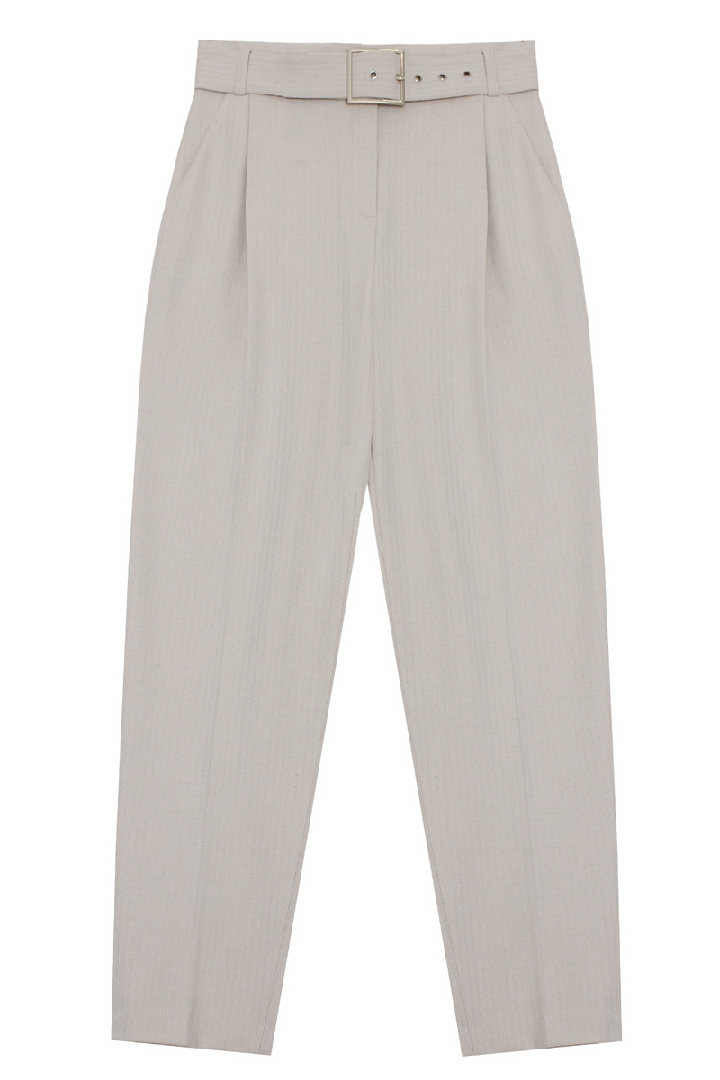 Брюки с высокой посадкой. Ткань из мягкой поливискозы. Рабочие боковые карманы. Декоративный карман сзади. В комплекте съемный пояс с пряжкой.