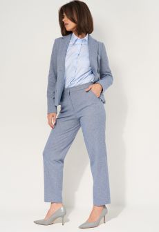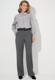Размерная линейка: от 42 до 54 размера. Цвета классические: черный, серый, синий. В качестве принта – универсальная клетка и полоса. Мы также предлагаем модели с разной высотой посадки: высокой, средней и низкой. В каталоге также представлены женские брюки на резинке!