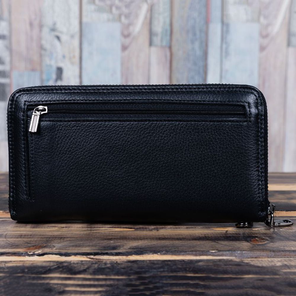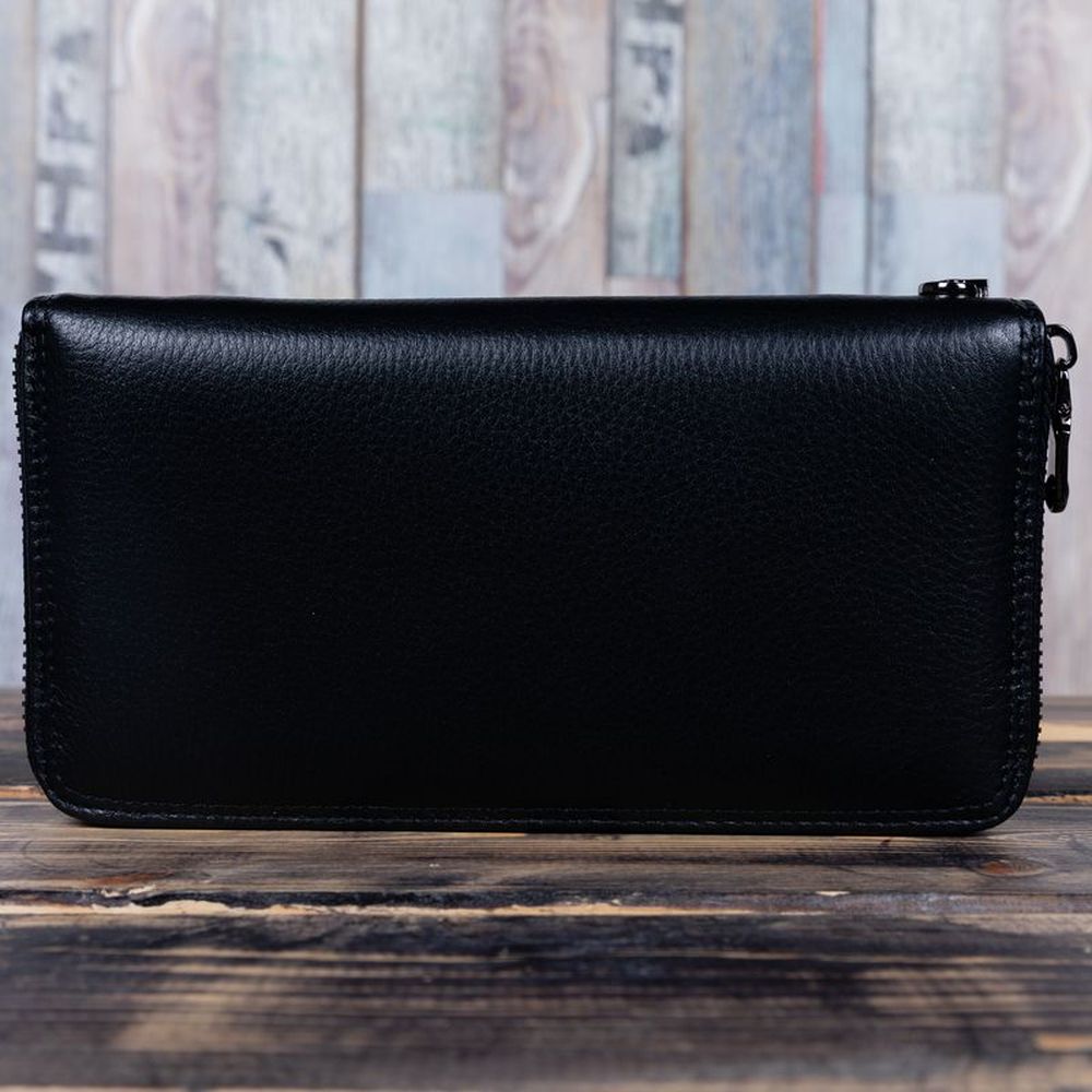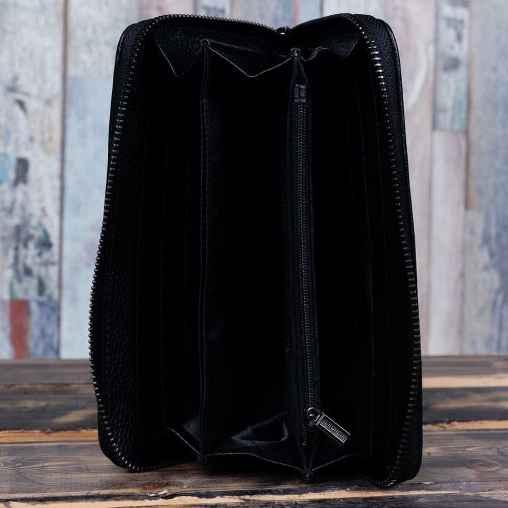 Изделие выполнено из натуральной кожи, закрывается на молнию. Наполнение кошелька: 3 больших отделения для купюр любого достоинства, 1 отдел-разделитель на молнии, 1 отдел-разделитель, 8 слайдеров для пластиковых карт и визиток по бокам, 2 потайных кармана, 1 карман на молнии с тыльной стороны, 1 съемная кожаная петля для удобной переноски. Тип застежки: молния.