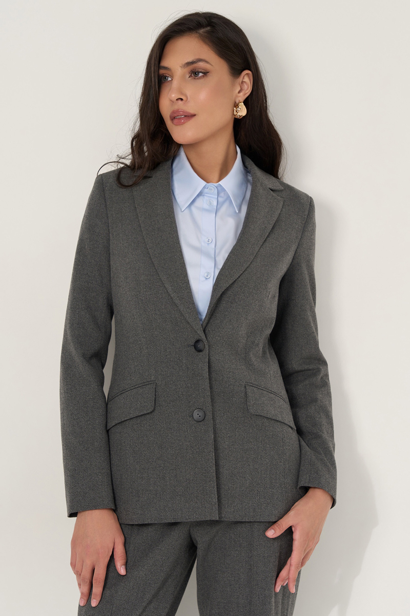 Женские костюмы с юбкой приталенного силуэта с лацканами или без них подчеркивают женственность облика. Материал – смесь вискозы, эластана и полиэстера.