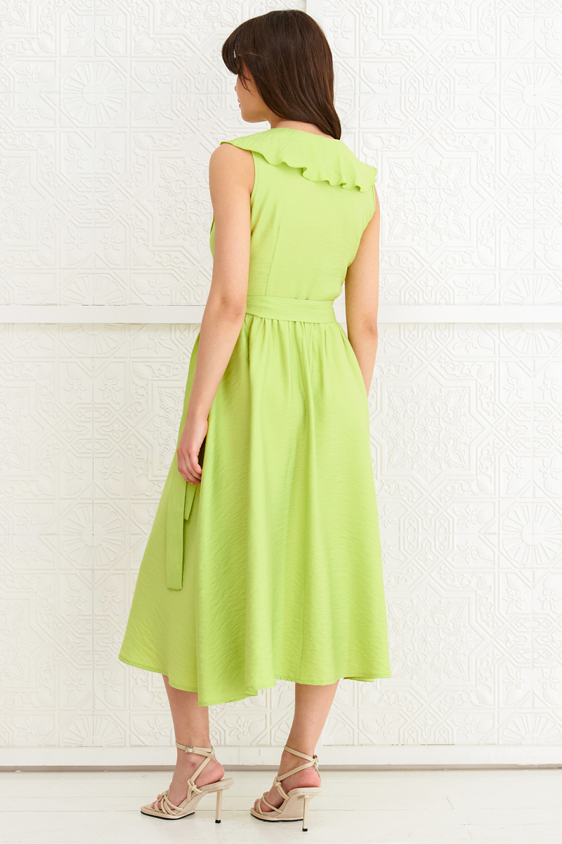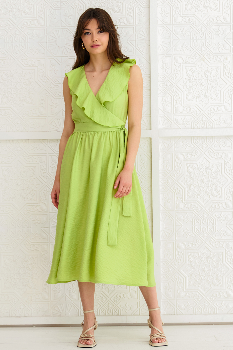 Женственное платье в трендовом оттенке из фактурного вискозного полотна. Модель приталенного силуэта. Отрезная талия. Верх по переду на запахе с рюшей по горловине, молния в боковом шве. В комплекте пояс из основной ткани. Длина: 114см.