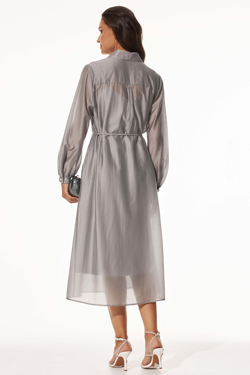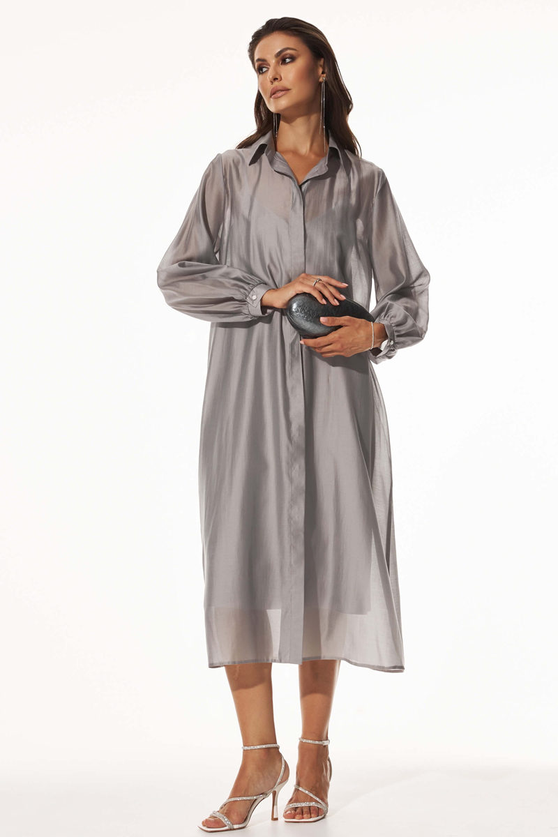 Двойное платье из воздушной вискозы. Модель состоит из нижнего слоя - платье комбинация из атласа; и верхнего слоя - платья-рубашки из воздушного тенселя. Застежка по переду на пуговицы. В комплекте тонкий пояс. Длина — 125 см.